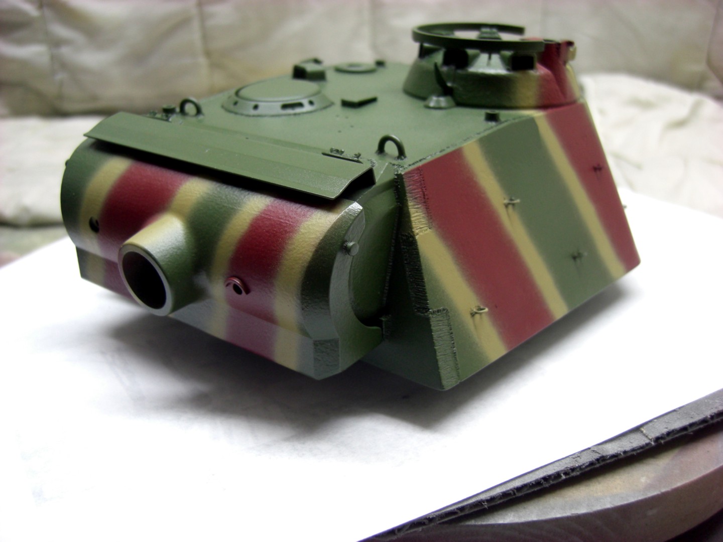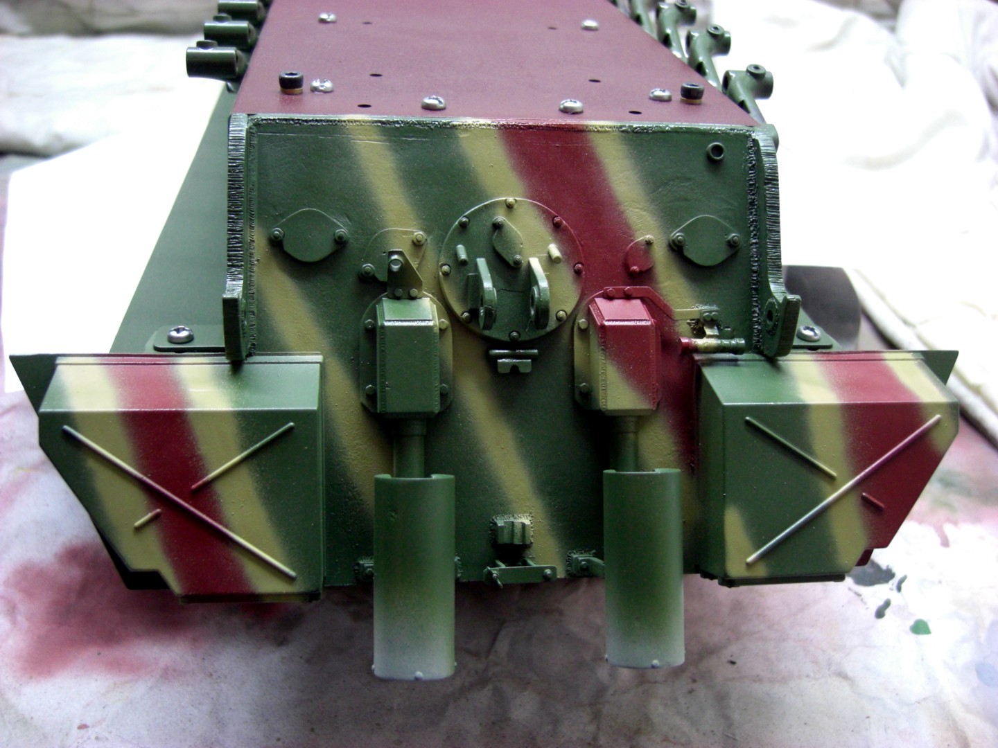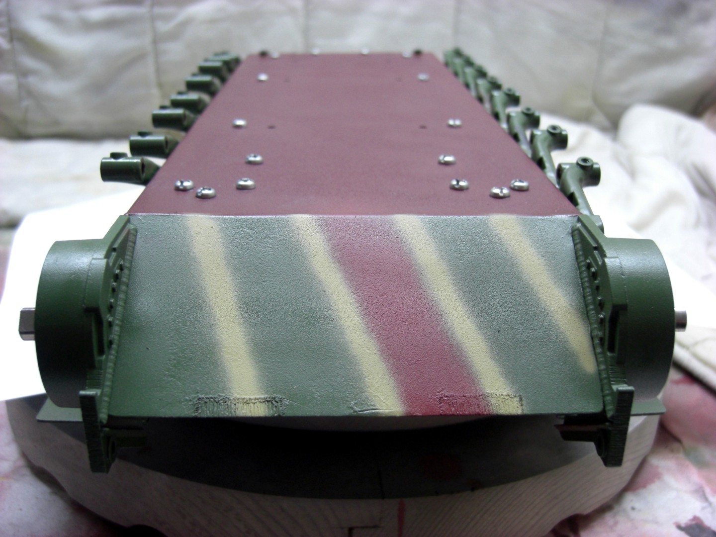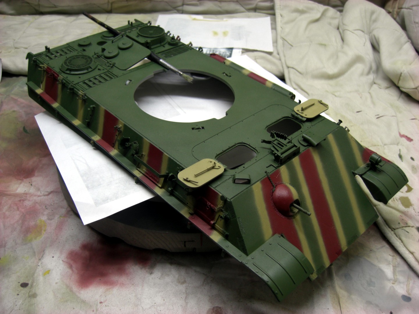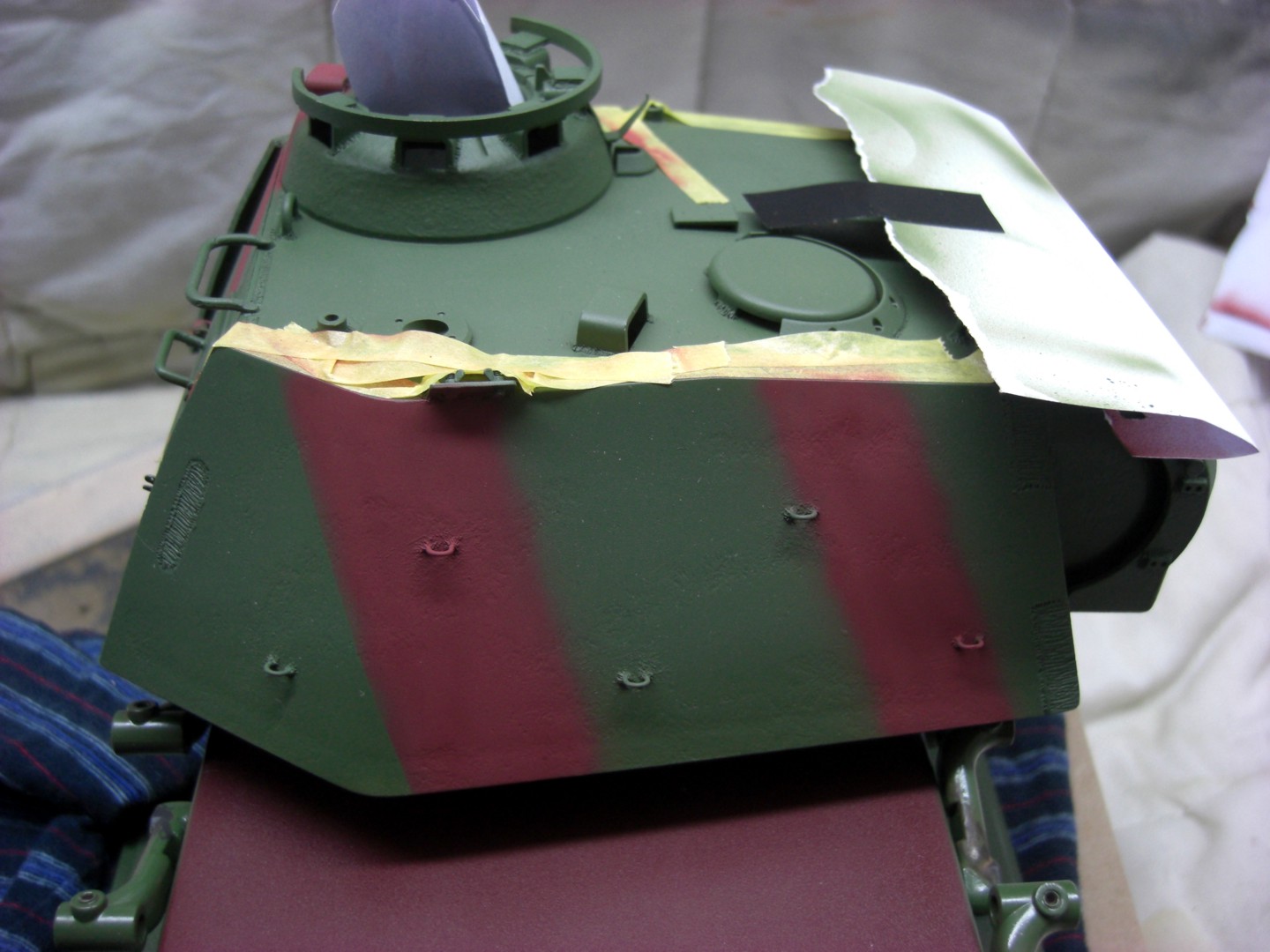 Soon it will go on and it will be exciting; coating the camouflage pattern on the tank…