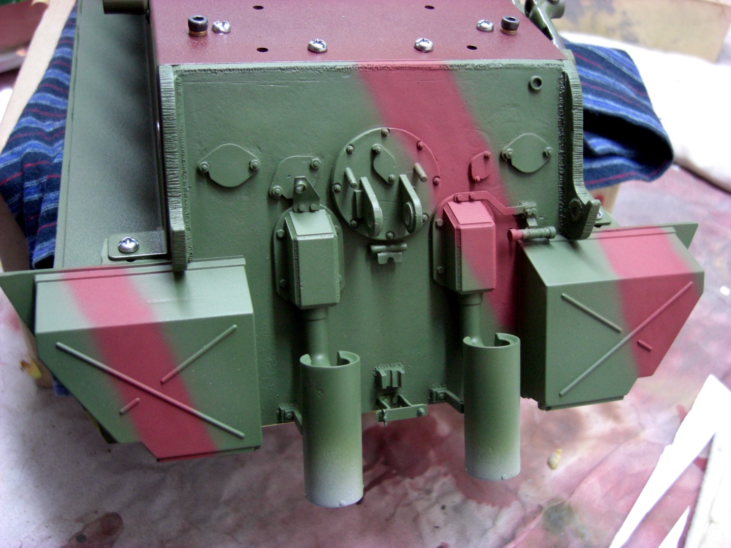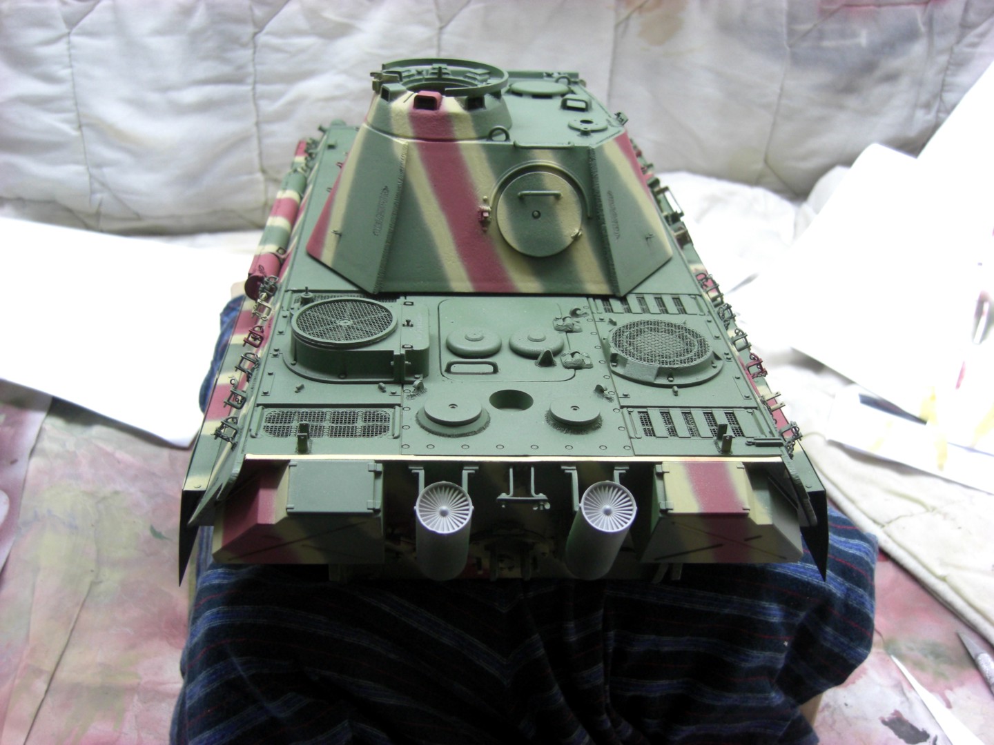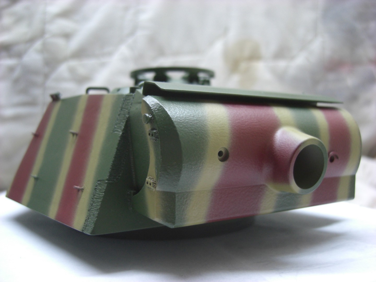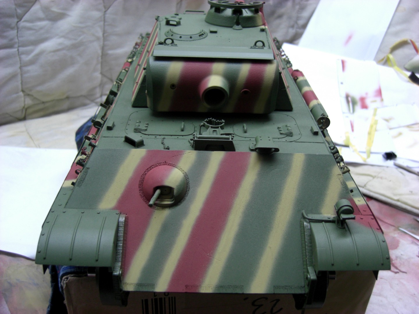 Soon it will go on and it will be exciting; coating the camouflage pattern on the tank…
