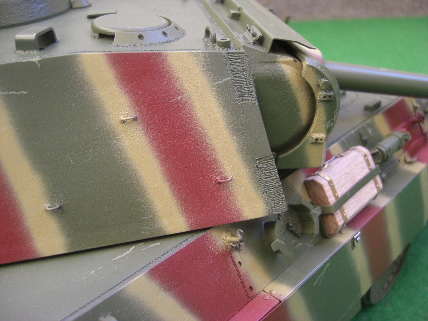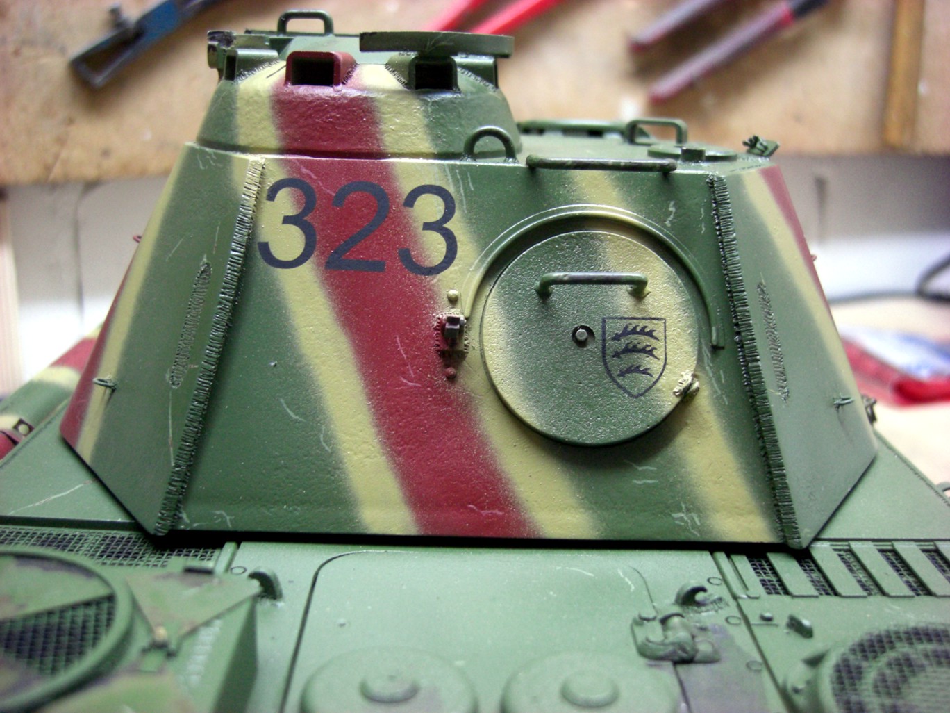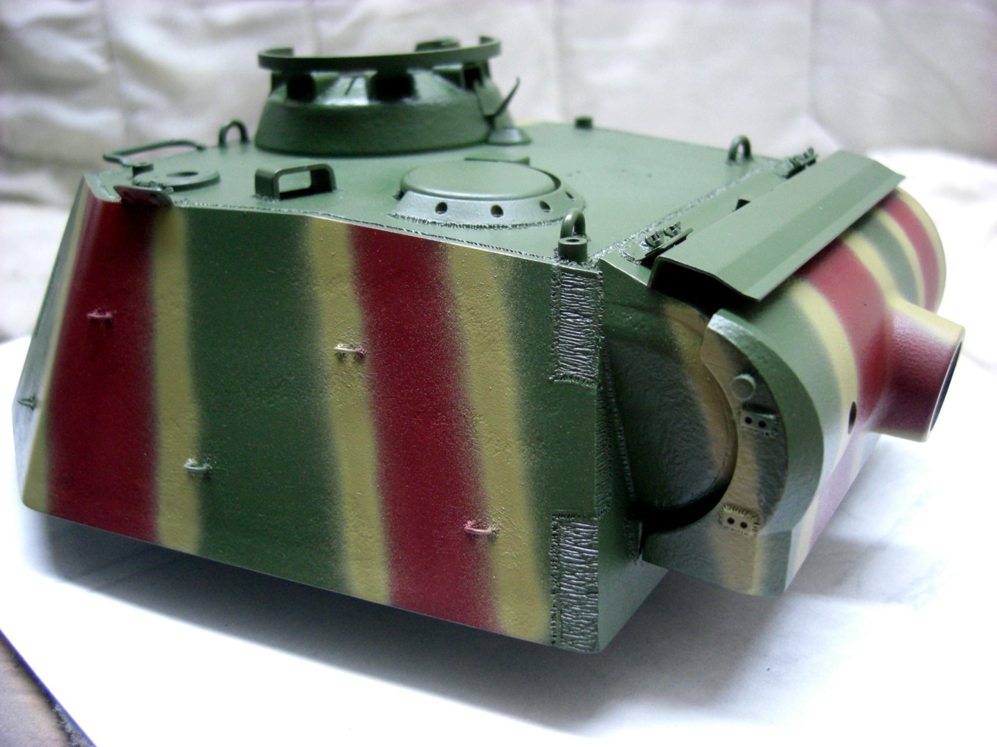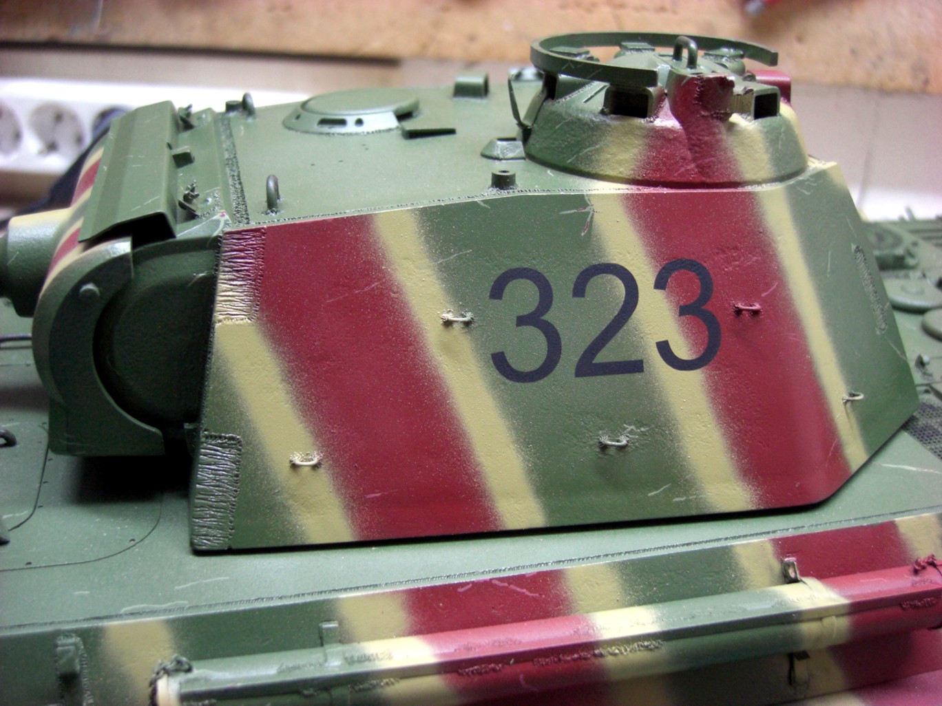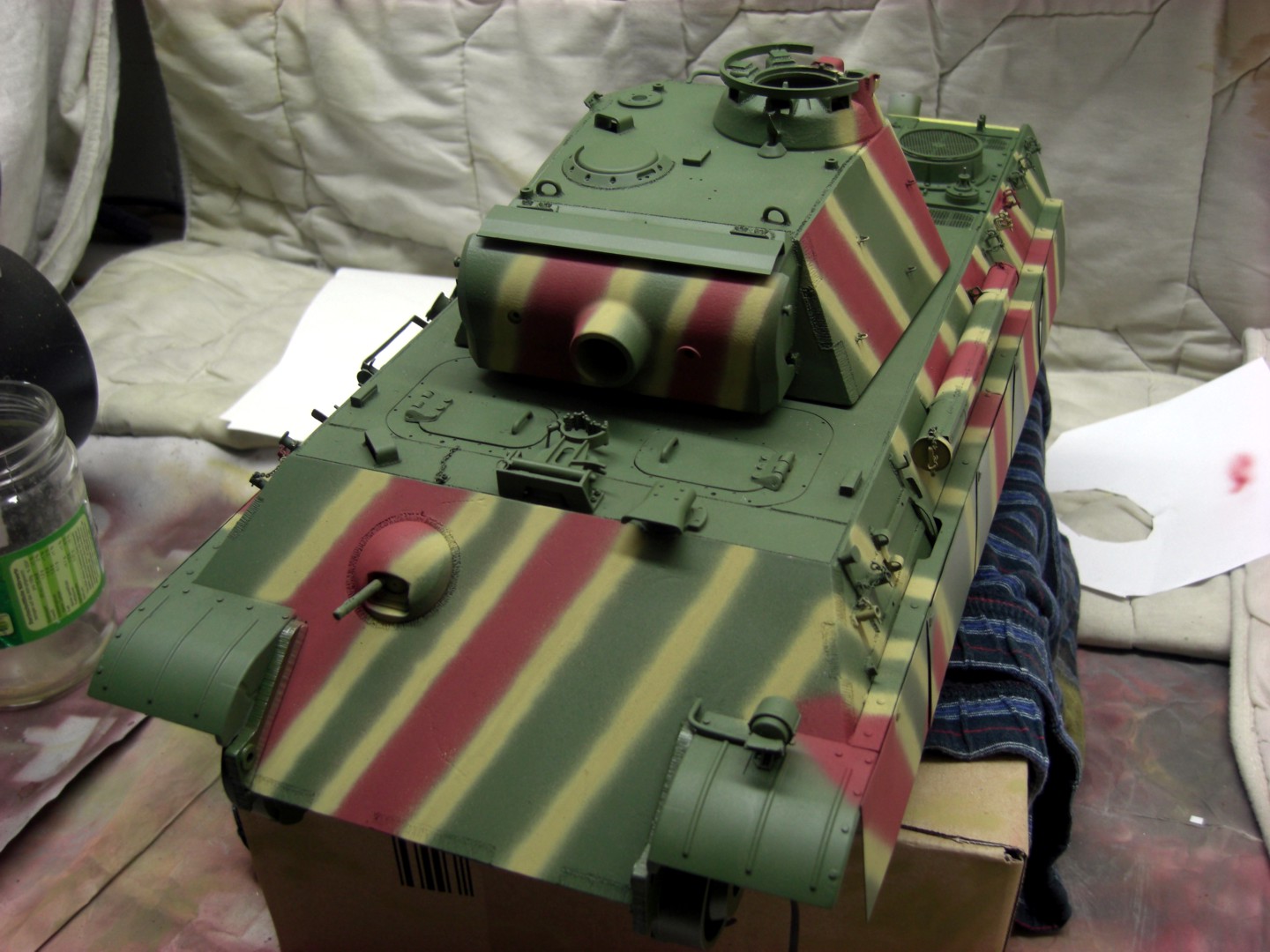 Soon it will go on and it will be exciting; coating the camouflage pattern on the tank…