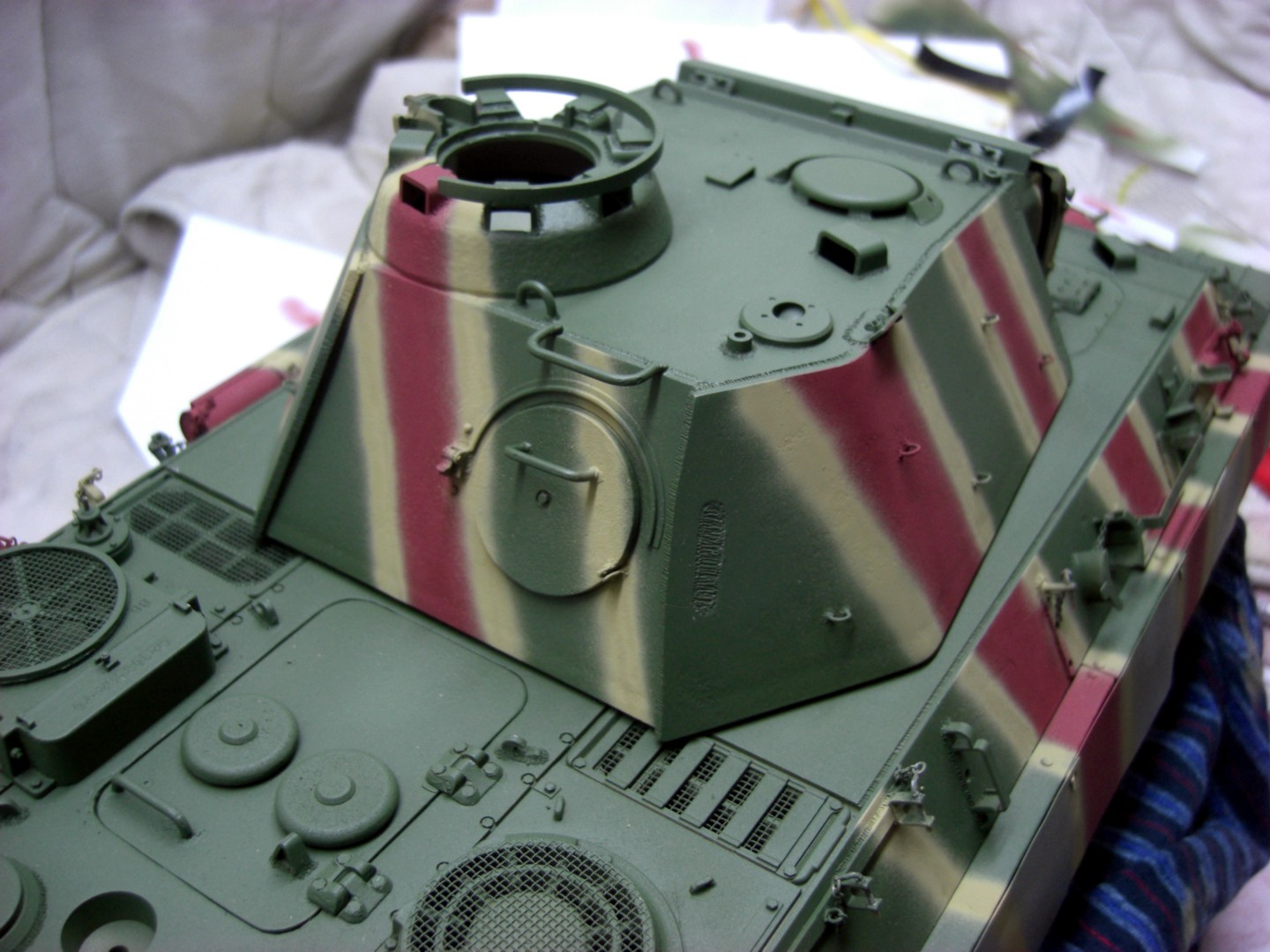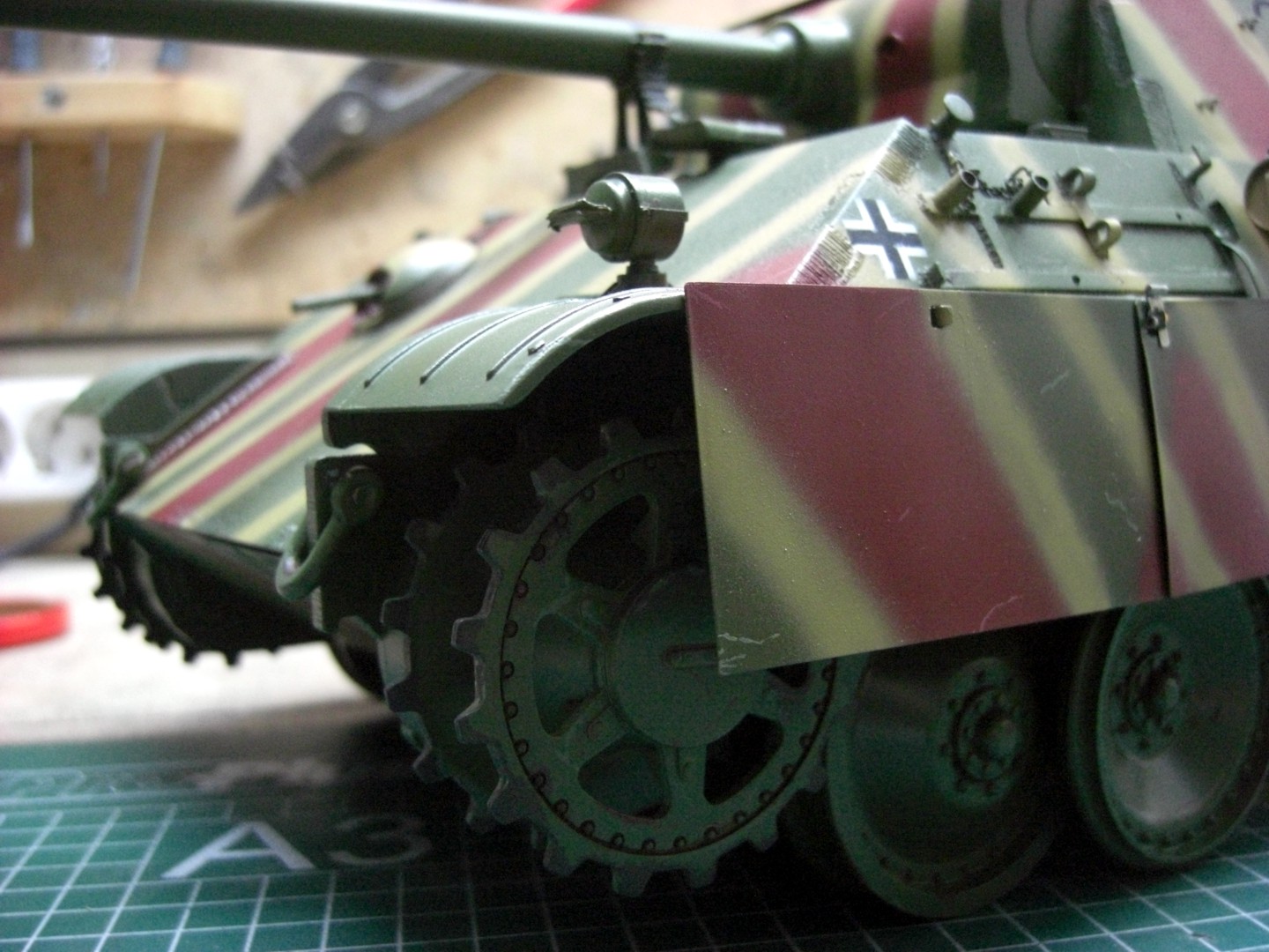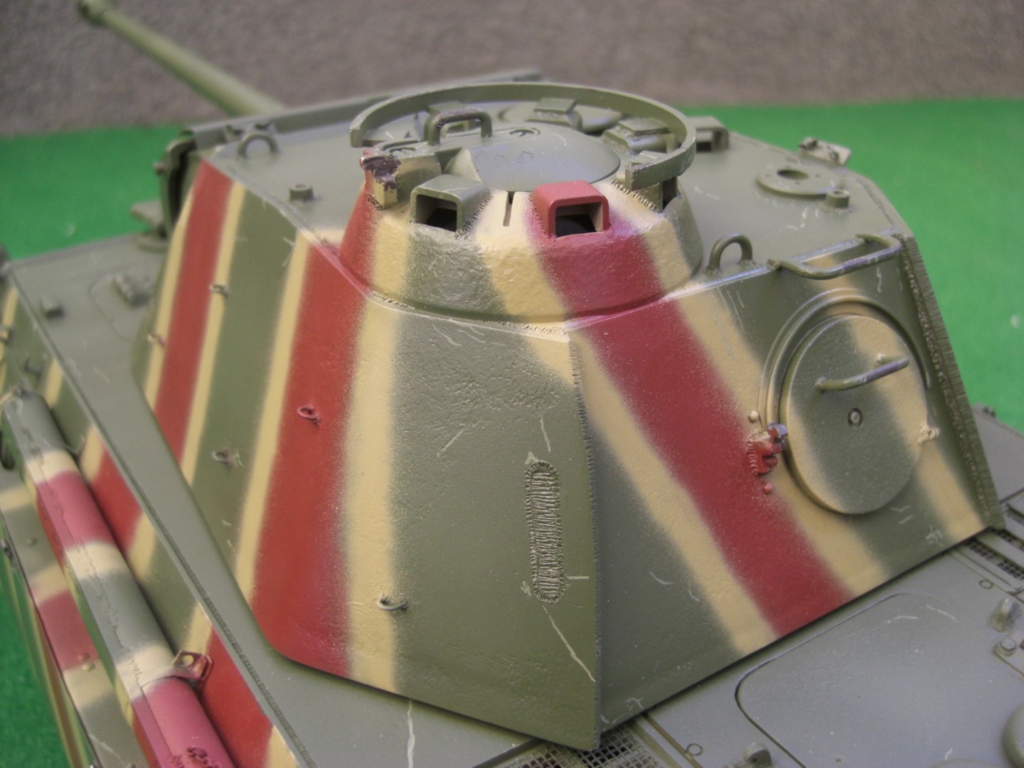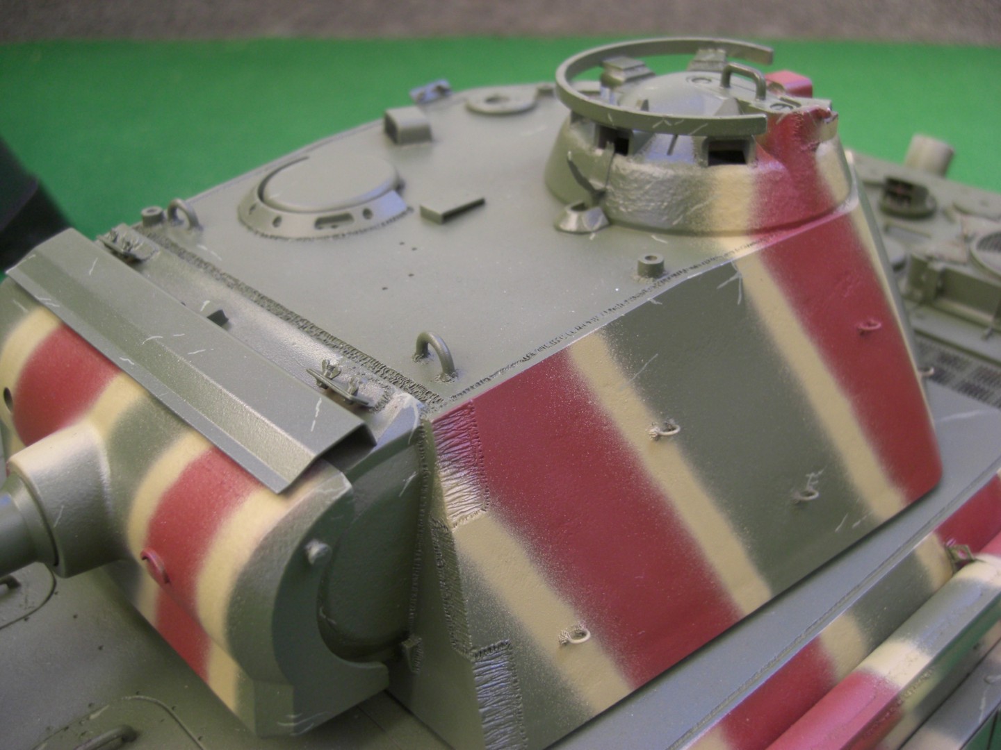 After camouflage painting and applying a glossy coat of lacquer, I've now started to make first chippings at the upper hull and turret; these are my scrapes and scratches on the camouflage at my Panther. For that is the Panther almost completely assembled; tracks and tools are still missing.