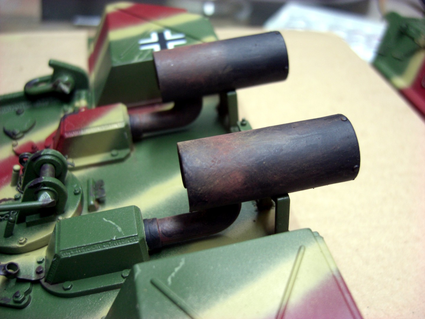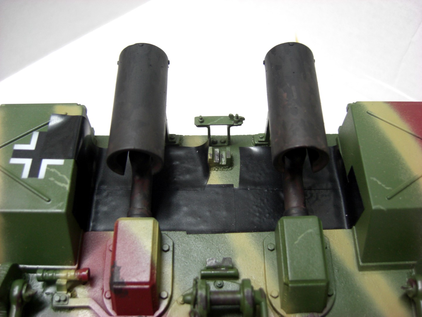 For the finish of exhaust systems at armored vehicles has each one his own ideas and methods. Started with masking the rear plate, here are again pictures of my implementation.