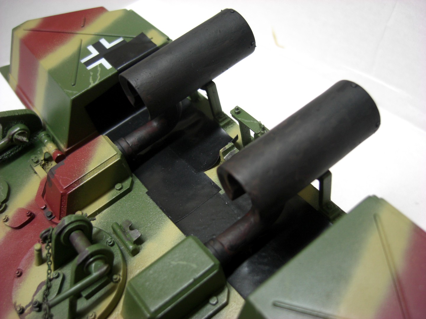 It goes on with my camouflage pattern, first the red brown patches and then the diagonal stripes in dark yellow. The edges are masked with Tamiya masking tape. I let the photos speak for themselves…