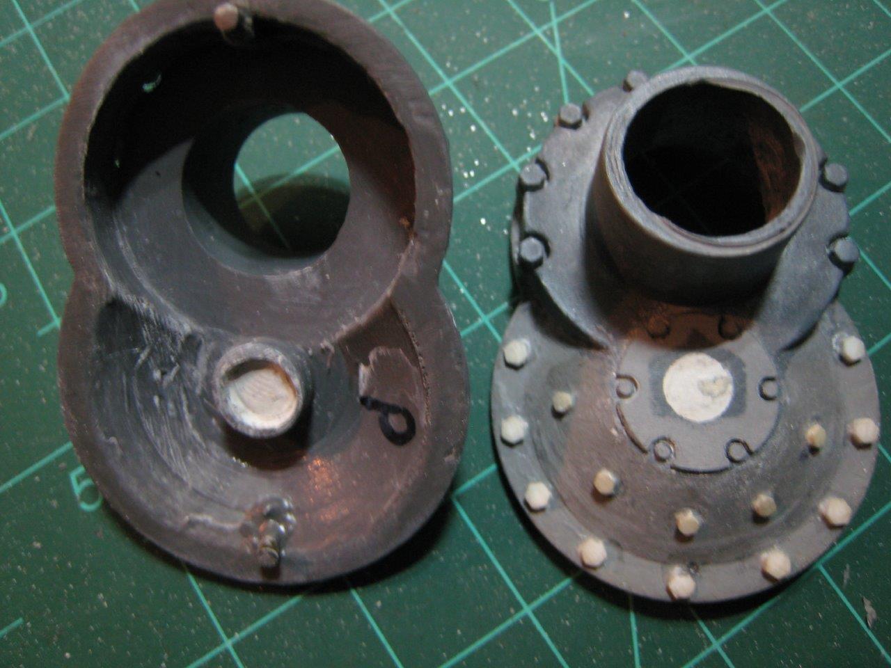 - I filled the center hole in the transmission covers with Milliput leaving a small gap on the inside for the magnet and epoxy. I installed a 1/4" magnet in the hull side and then another one in the transmission cover, securing them with JB Weld. (Note: get the magnet orientation correct in this step or the 1/4" magnets will repel each other and the transmission cover won’t seat against the hull.)
