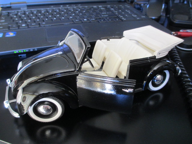 The Lords O' The Post smiled upon me today and several boxes arrived with more Village scenery bits. One of these is really interesting. It is a metal French Solido 1949 VW Bug. I had seen several Wehrmacht VWs and wanted one for my village but the 100.00 + cost of the plastic 1951 models kept me from pursuing the idea seriously. Typing diecast VW into EvilBay found this gem and being careful about the auction times brought success and saw it delivered home today. It will get a repaint and some gear and soldaten added and be a nice addition to the scenery. The other bits were some 1930's diecast gas pumps in 1/18 and a super nice Yat Ming 1932 Ford coupe ( some prosperous Farmer or Businessman's prize possession before the War started, no doubt ) to place in town. More to follow and things are coming together faster now that the move-in is nearly complete. Pics: