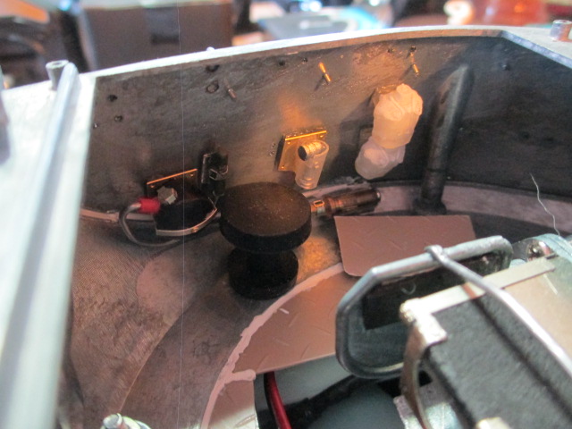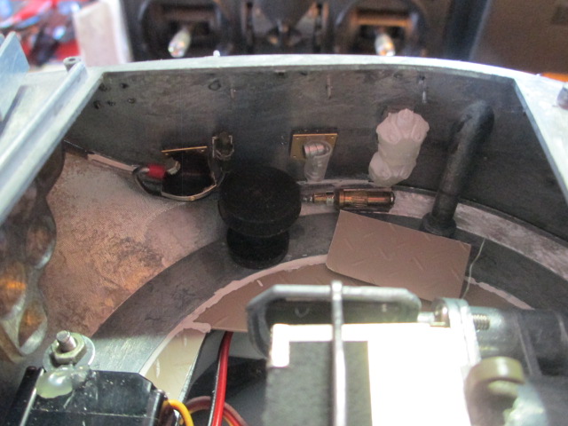 Todays mail brought one of two Fire Extinguishers that I had ordered in different scales ( to see which one might work best ) but the other one will have to do since the 1/12 one I now have is comically large even for a tank. As the afternoon turned to rain showers, I went to work on most of the rest of inner turret detail. Aside from some wire and a couple of bits of leather padding ( and the still missing fire extinguisher ) all of the turret detail is at least built. A few pics: