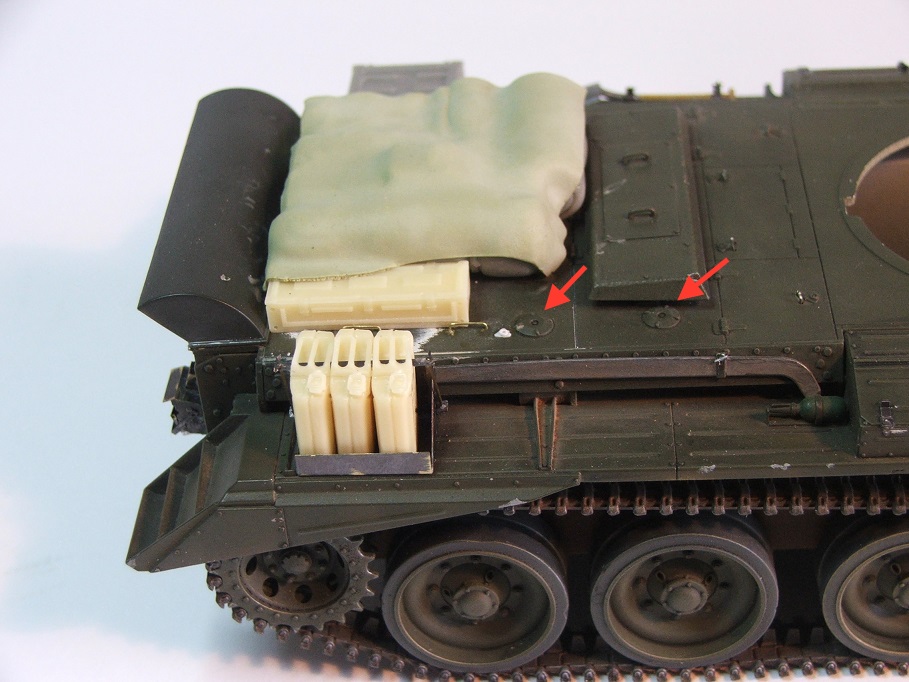 When all's done and dusted, I'll be using the MIG British Olive Drab- SCC15 (1944 colour) for the final tarting up process. I've also made and fitted an intercom box (field telephone on rear of tank) for the rear panel; but have yet to make a towing hook, along with that the two smoke candle discharger boxes that sit either side of the Phone. Then...the external build will be complete. Phew... For the benefit of rivet counters, apparently it was only very late