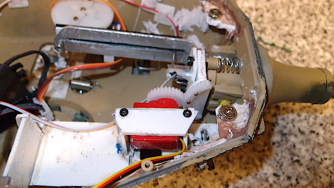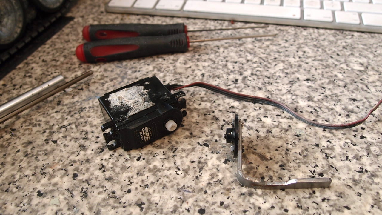 Time for an upgrade , the turret rotation servo has died . The little micro one with plastic gears stripped, metal gears from now on. Never liked the servo elevation with lever changed to a gear servo , fitted a spare to check while waiting for ones with more torque.