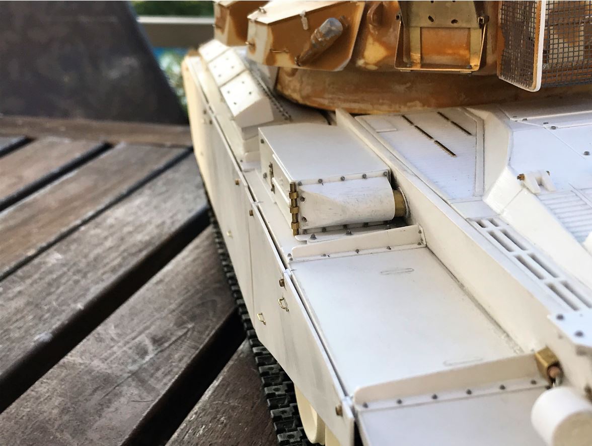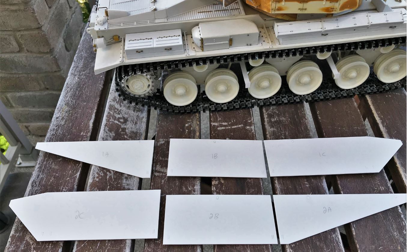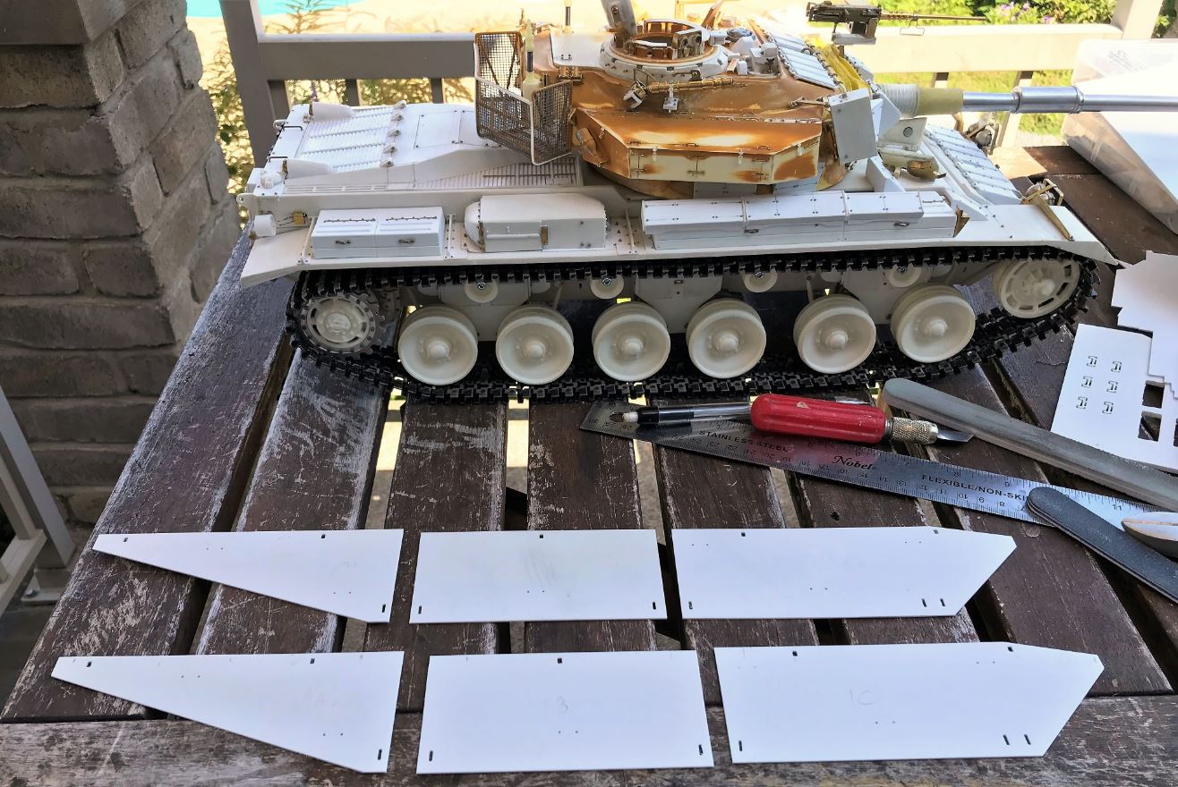 I used M1.4 brass screws and 1.5 metal roundels to fix the skirts on the hull. Smaller screws would become weak and might break after removing the skirts a few times. The skirts are therefore removable, a must for this tank. I ran out of roundels and need to order more. Notice how the holes on the skirts allow for vertical adjustments, very useful and similar ro the real thing. The skirts are usually not that strait on the real tank also, so putting them a bit unaligned is realistic.