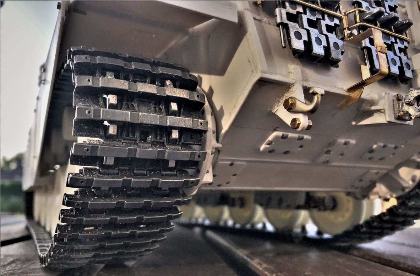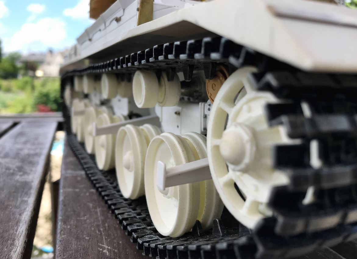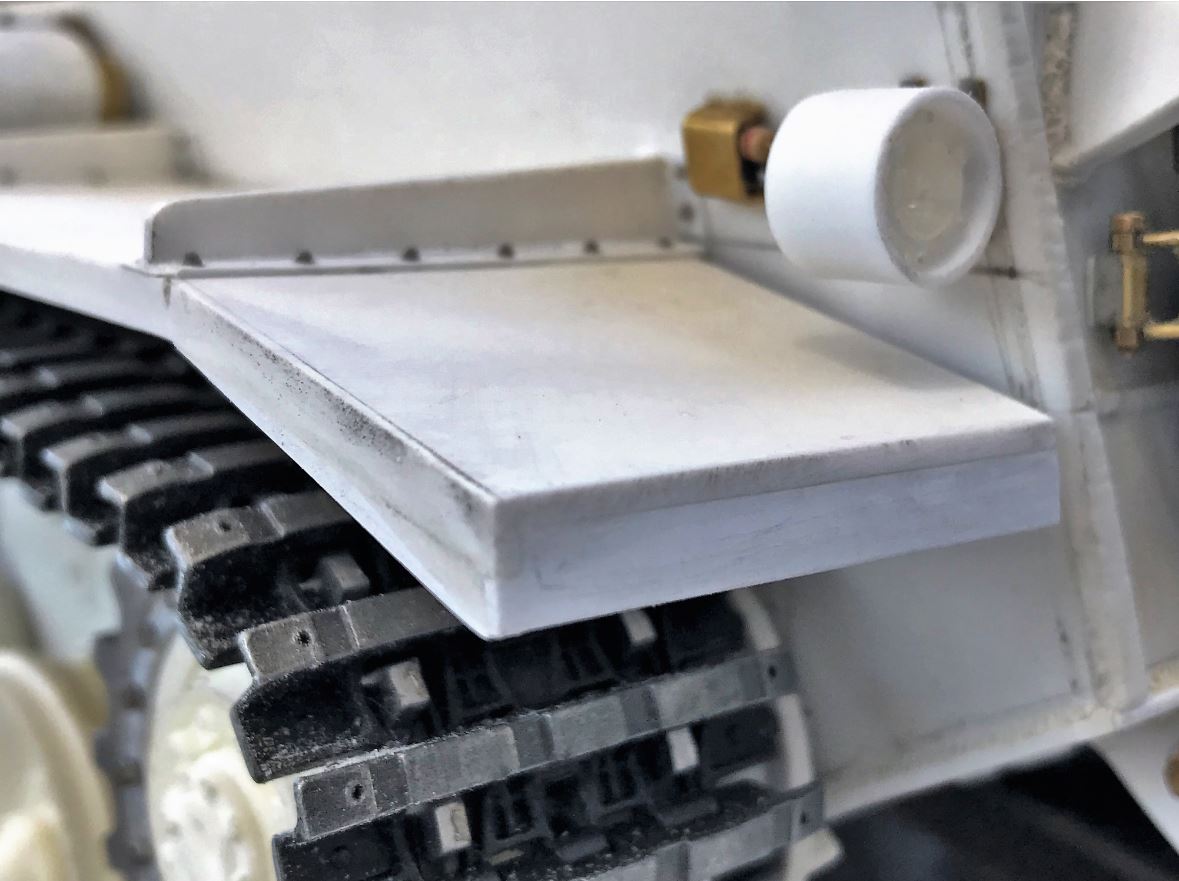 I used M1.4 brass screws and 1.5 metal roundels to fix the skirts on the hull. Smaller screws would become weak and might break after removing the skirts a few times. The skirts are therefore removable, a must for this tank. I ran out of roundels and need to order more. Notice how the holes on the skirts allow for vertical adjustments, very useful and similar ro the real thing. The skirts are usually not that strait on the real tank also, so putting them a bit unaligned is realistic.