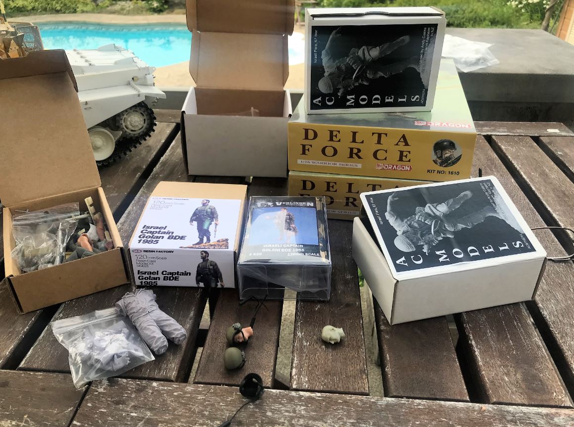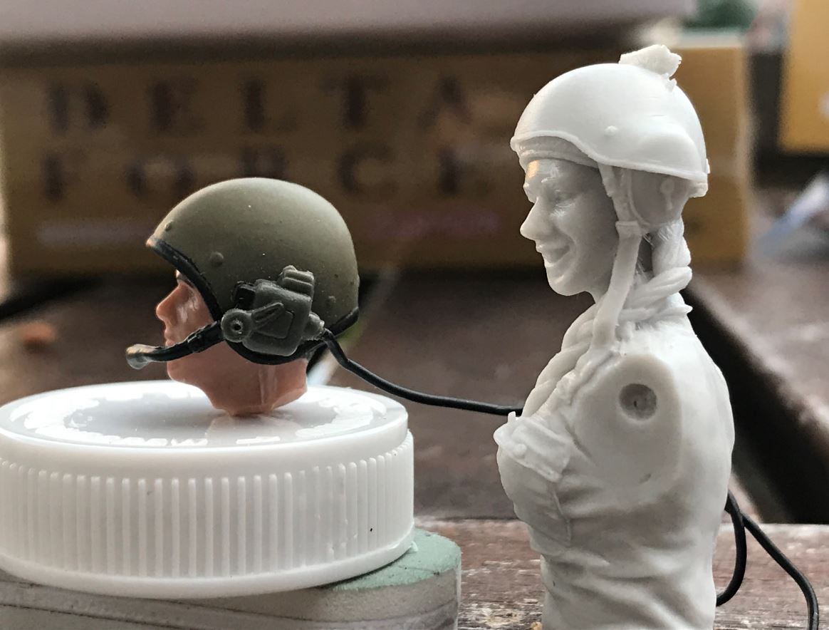 I have the two helmets available. The 1/18 Ultimate Soldier American helmet and the 1/16 Israeli from Sol Models, coming with the female crew. I was thinking about removing the female head and reuse the helmet on a man's head. I honestly prefer the shape of the American helmet. But I was concerned about the advertised 1/18 scale, being maybe a bit too small, but when I compared it side by side with the other, I realised the American helmet is actually bigger, so American it is. The cute babe will keep her head, for now. Its the men that will lose the top of theirs for a good fit.