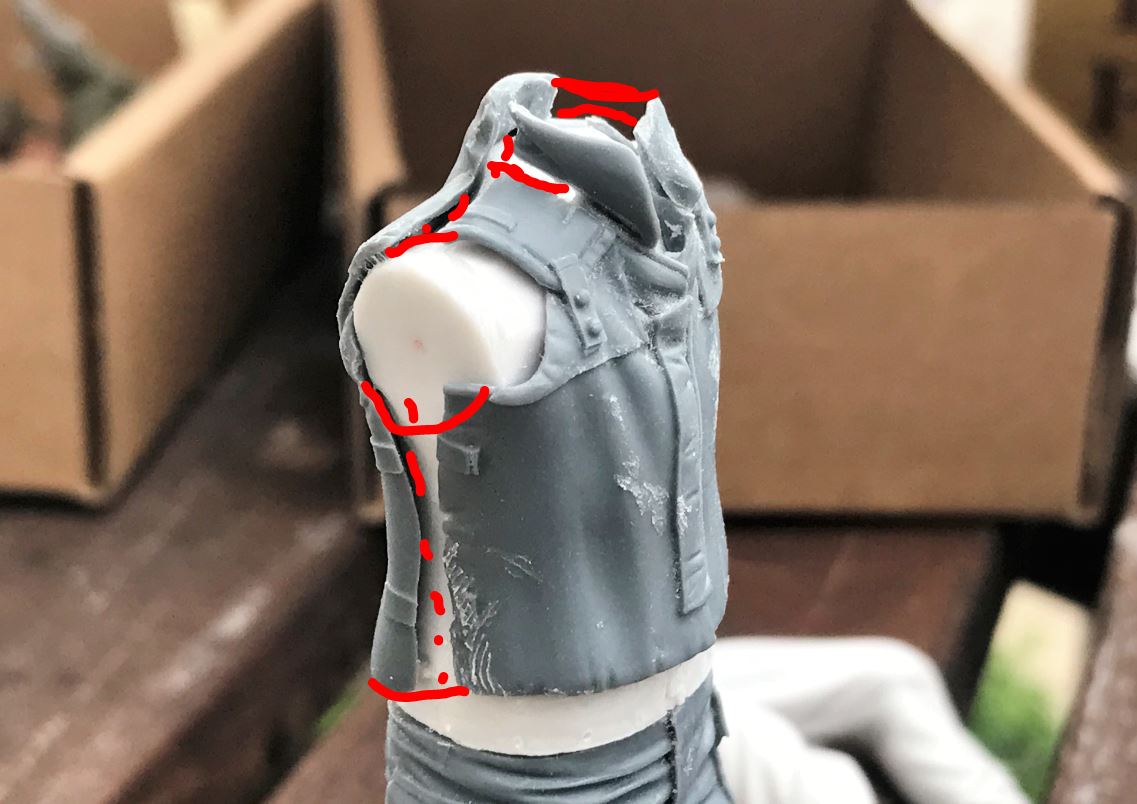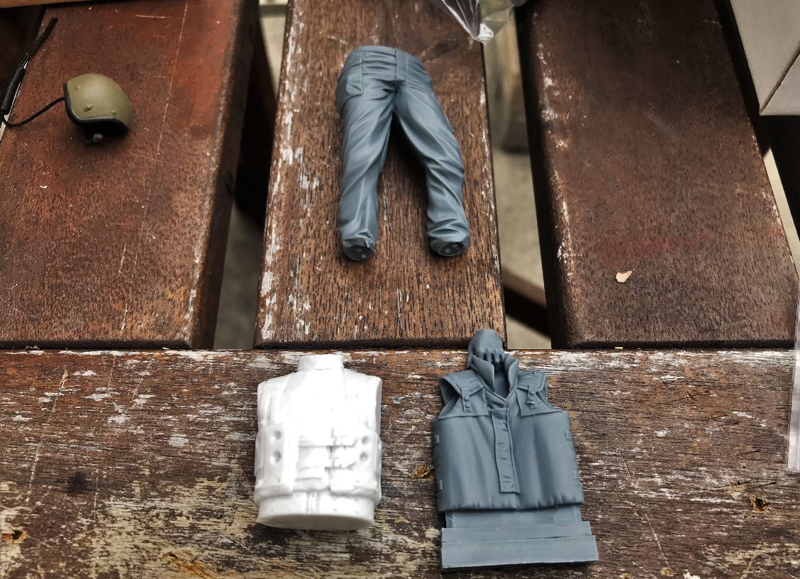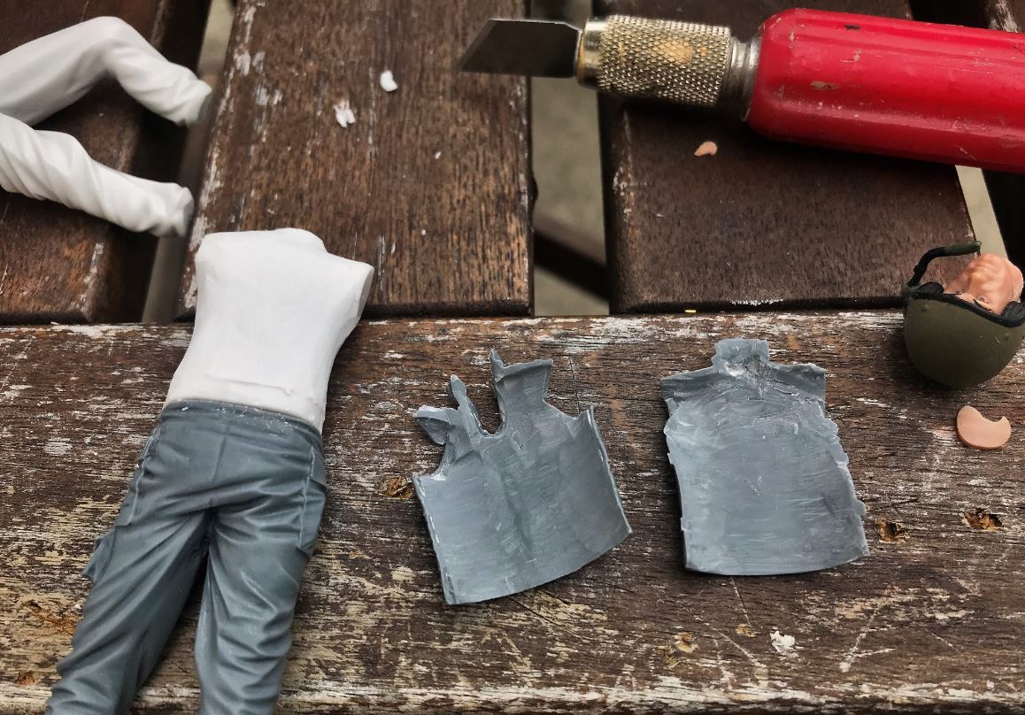 The jacket parts are thinned from the inside with a dremel. I used the Sol Model torso of the Golani soldier for the commanderr. It had to be thinned. All features are removed so that a clean torso surface can accept the flak jacket.