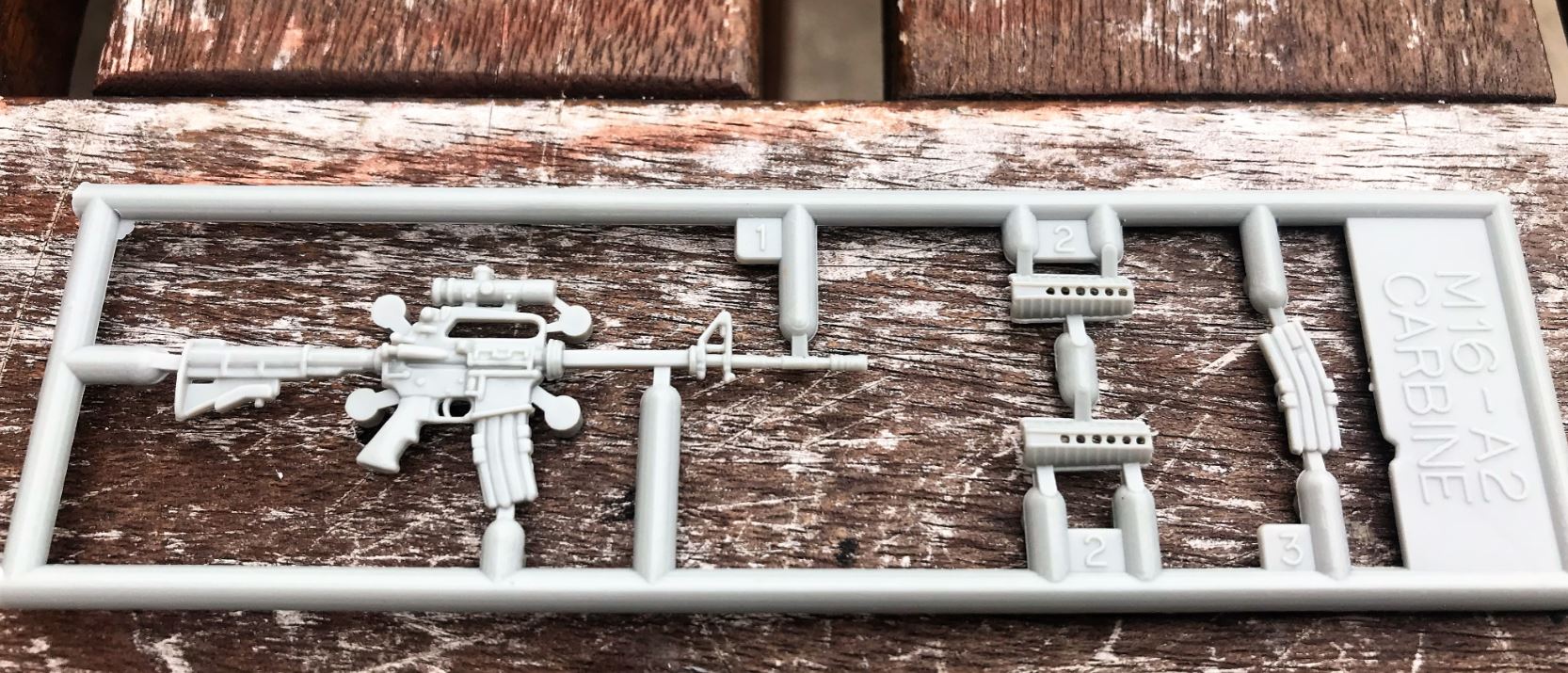 He will be armed with a CAR-15 carbine. The Israeli army of the 80s did not seem to have a standard weapon. Men can be seen carrying Galil, CAR-15 and AK rifles. The Galil being very heavy, many men preferred the CAR-15. I will need to retrograde this CAR-15A2 to an earlier version.