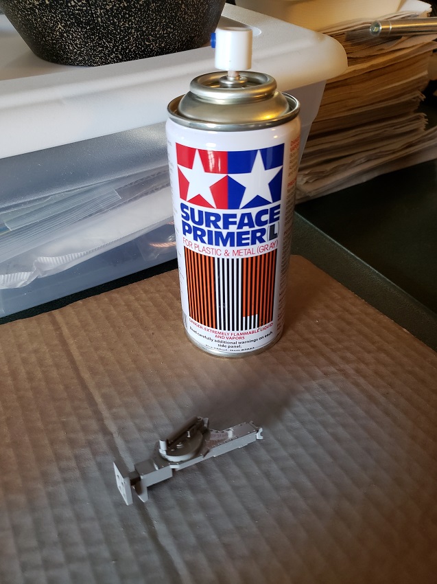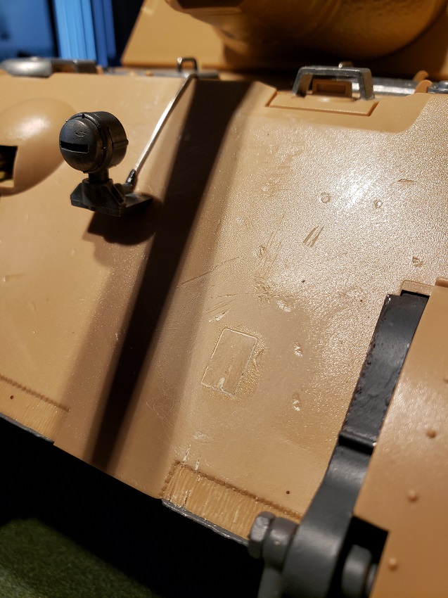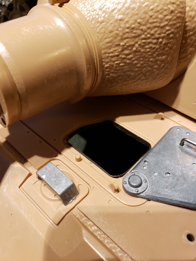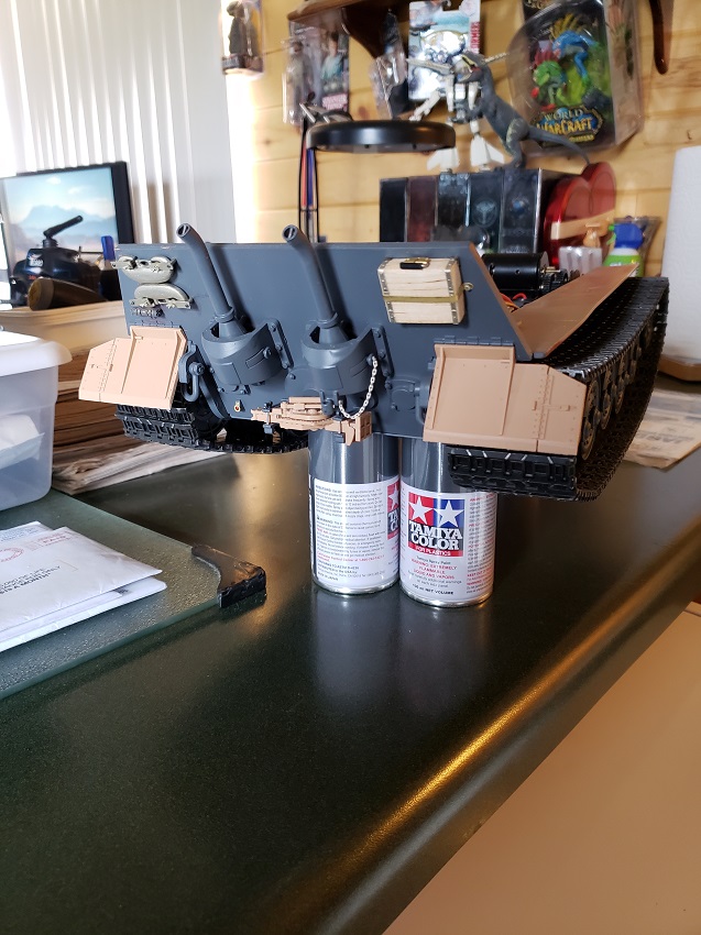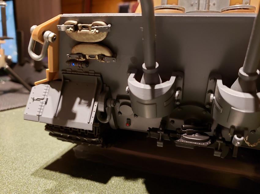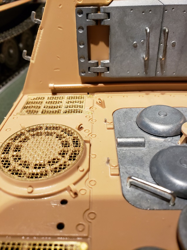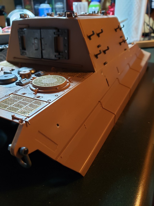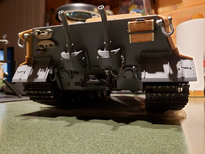 I got restless waiting for the seasonal ( now apparently ) rains to let up so I bit the bullet and did the detail painting in the kitchen. The primer is the worst but only small amounts were required this time. Rear armor is painted and detailed and awaiting the weathering of the panzergrau.