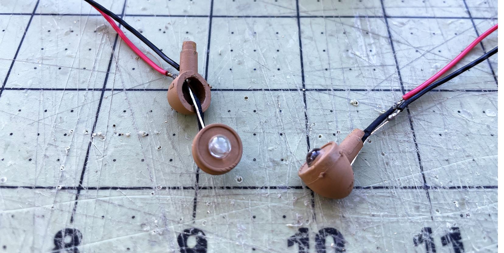 Crude plastic Heng Long Pz IV headlights are used as a base, and stripped out.