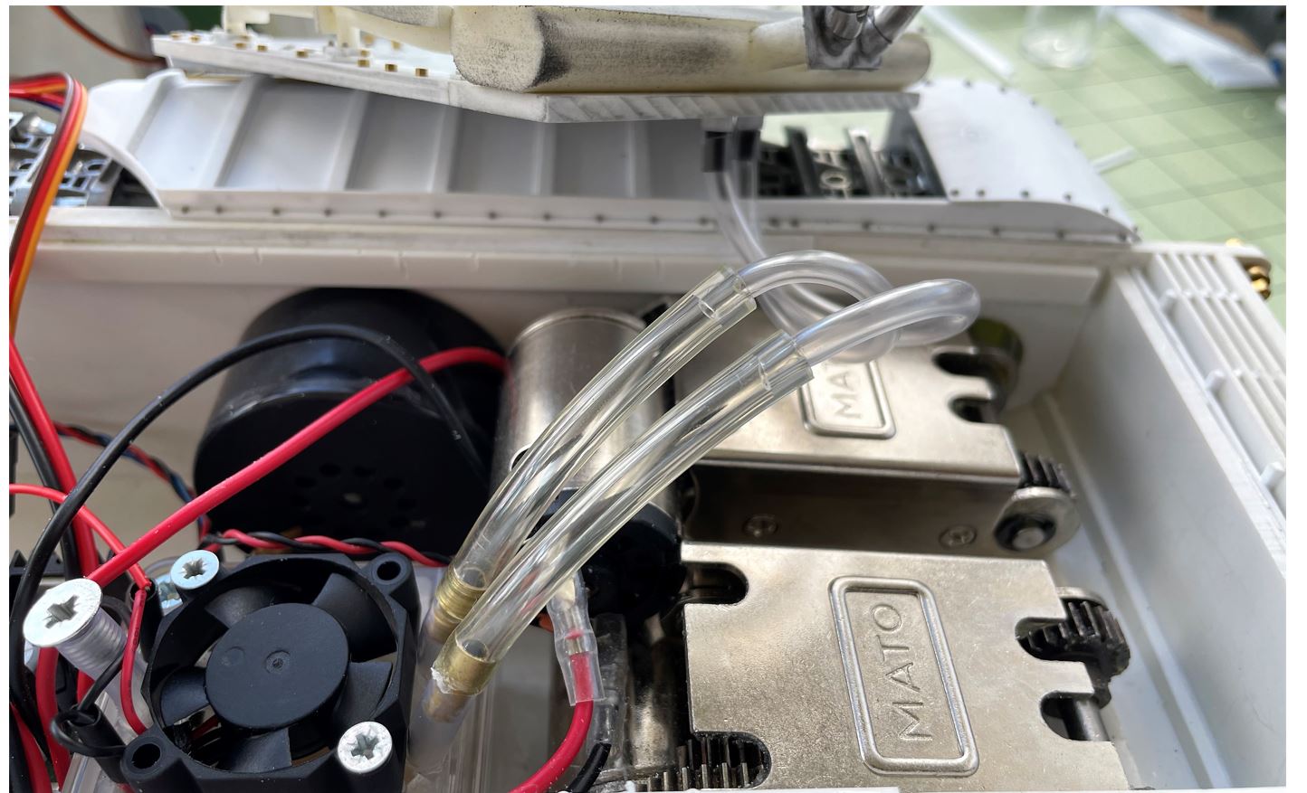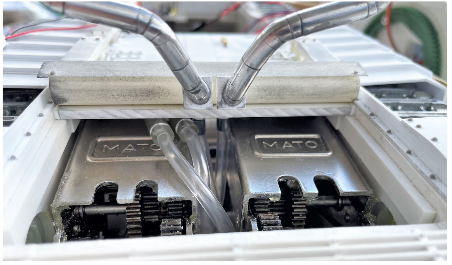 Space is very limited over the gearbox, no room for 90 degree joints for the tubes. So, the larger flexible tubes come out of the smoke unit, go towards the back over the left gearbox which has the motor at the bottom, then the large tubes switch to smaller flexible tube, they go to the left and down, do a loop back between the two gearbox and then upright strait into the exhaust pipes.