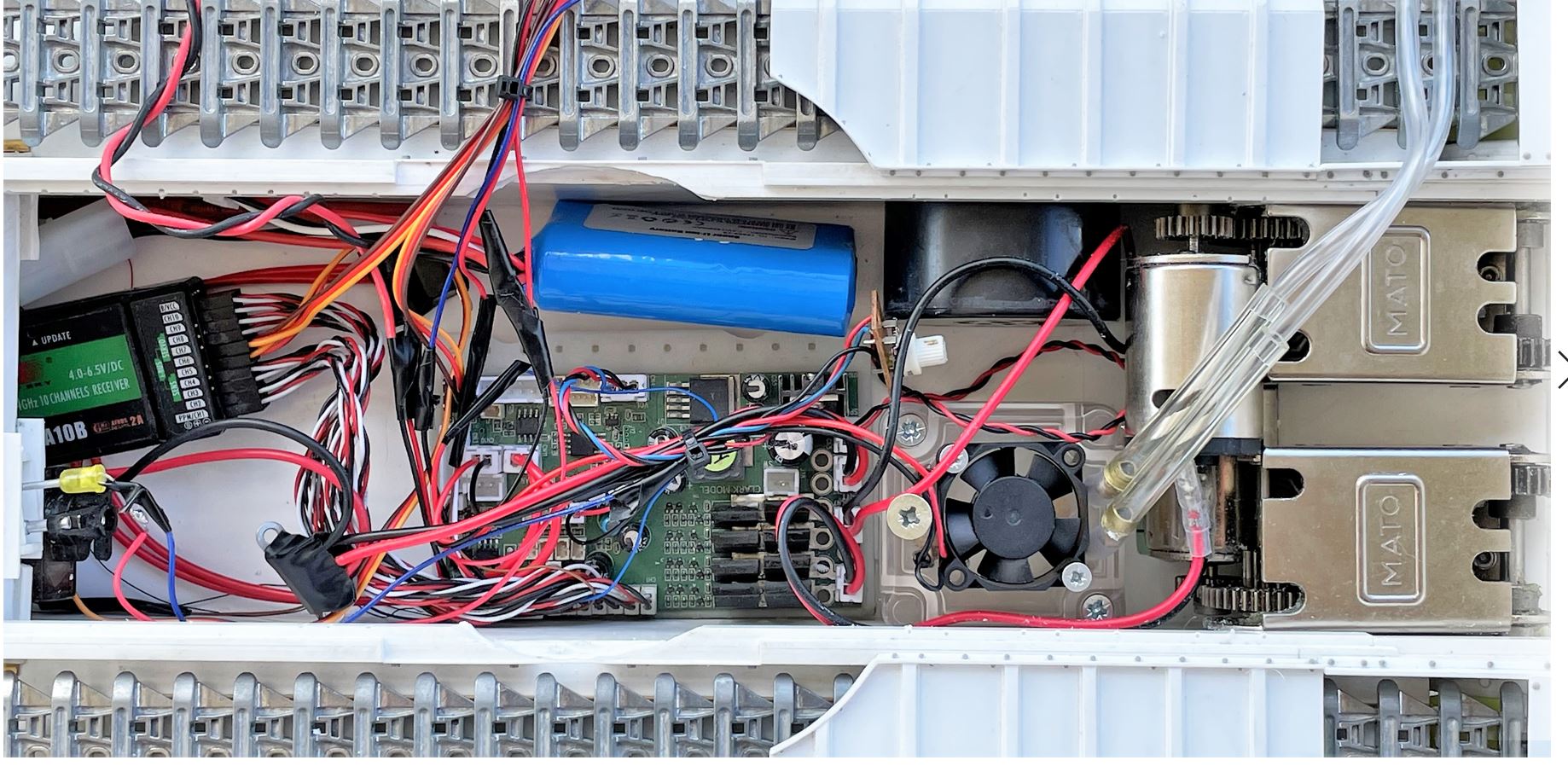 View of the electronics under the hood. The Churchill setup like this is providing exceptional access to all electronics by simply lifting the desired section (there are 4), including the turret. No need for magnets, the removable sections firmly slide into their allocated slots and supports on the chassis and turret.
