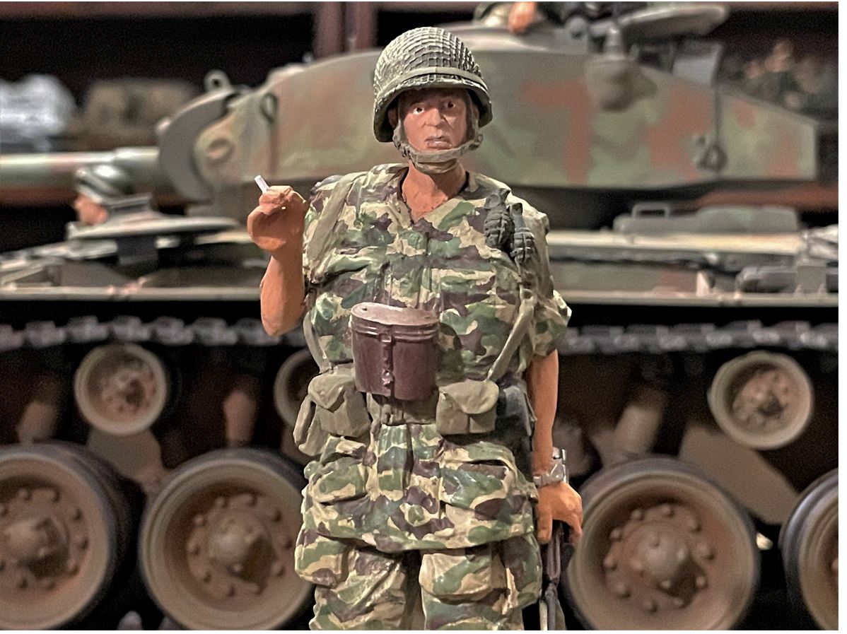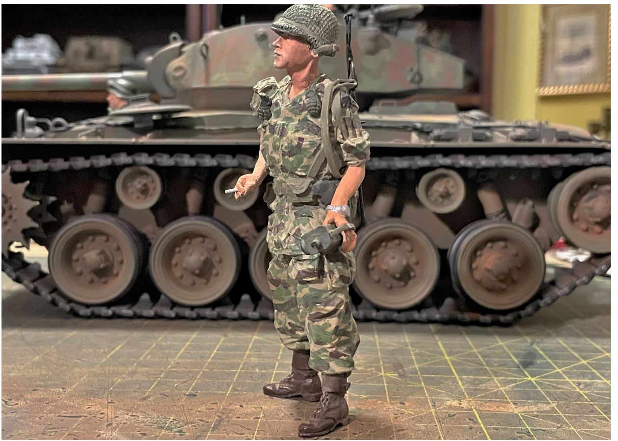 I gave the captain a heavy combat uniform, not the light tankers khaki uniform used on parades and low intensity operations. Pictures of Hervouet later during battle do not exist so this uniform is an assumption but is aligned with the picture of other crews. Once fighting has started in Dien Bien Phu, one never knew when the crew had to disembark in the middle of battle, and likely at night, in the rain with artillery fire.