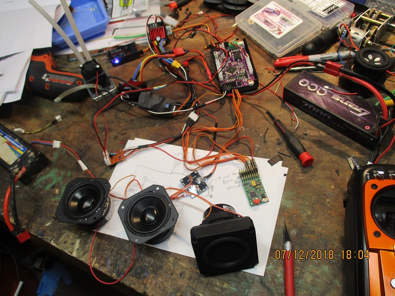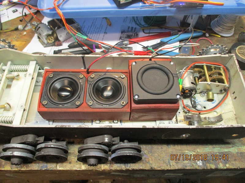 Benedini sound wired up. I chose the Panther sounds because I liked the engine idle and throttle the best. I am using two series wired 4 ohm mid-range speakers, and a 4 ohm min sub with a 3.3 ohm resistor. You can get these at Parts Express, not expensive and sound pretty good. They will easily fit into this tank.