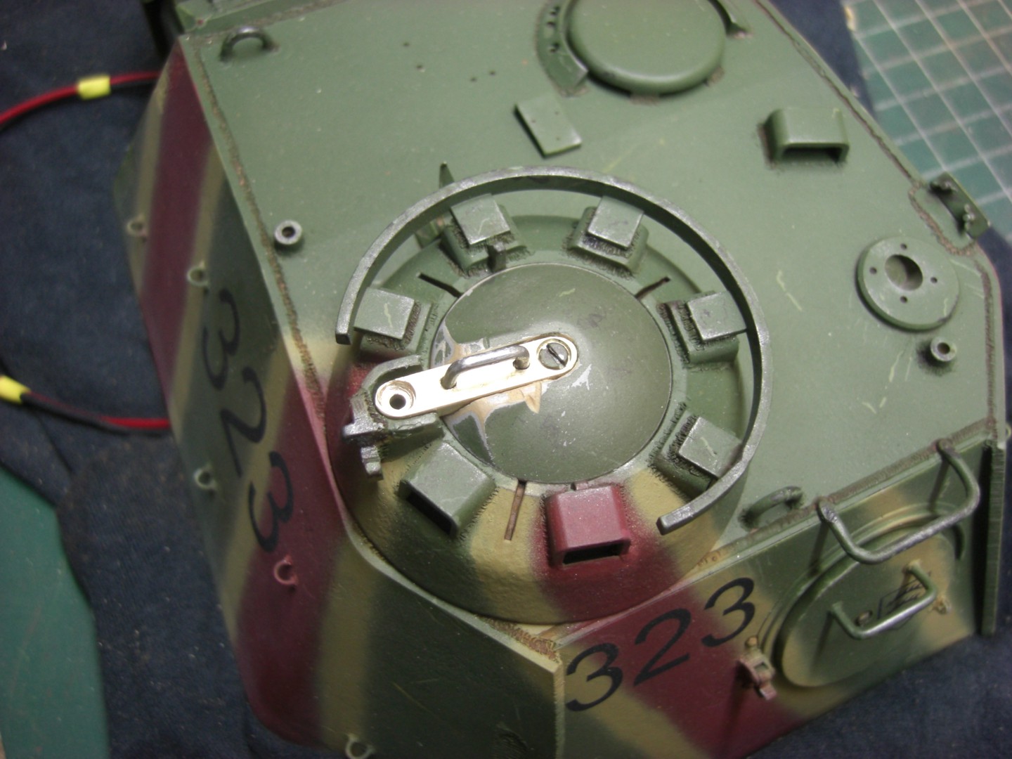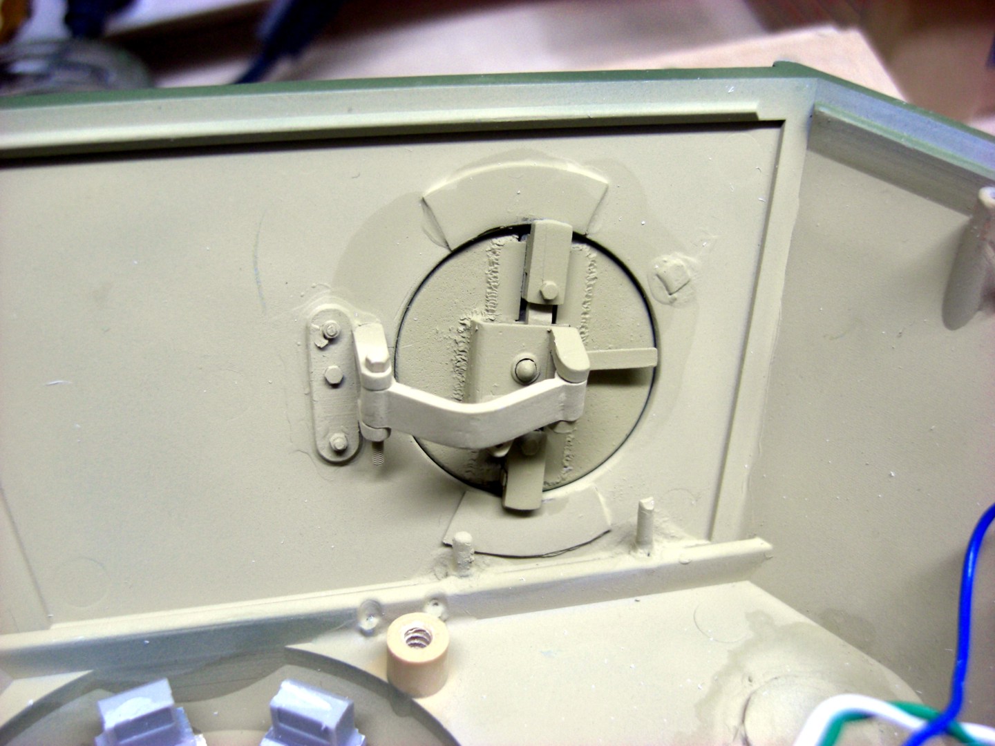 Another small correction was made on the antenna foot. Tamiya has here 4 bolts mounted, but after short exchange of ideas with Jeff (many thanks again) and a look on many photos shows only 3 bolts on the type G (a few also with four bolts), but WeCoHe and Schumo Kits have also taken the latter variant. That’s why I made it too and it is also not a big problem. Old bolts cut off with a scalpel, drilled three small holes and screw heads M 0.8 glued in.