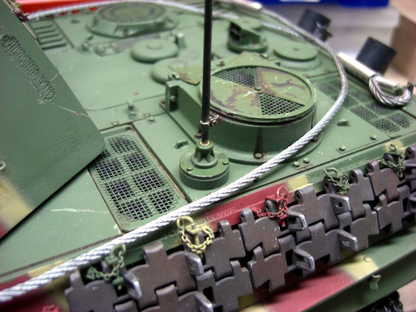 A good way to weather the tow cables that I use, is to paint them flat black then use a real thinned out rust and let it flow into the cable, then I use the Tamiya grease (from the 3 color compact) and rub the surface from there, it looks awesome...