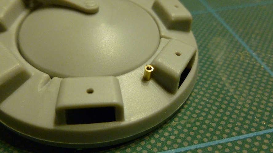 20-After gluing back on the Turret lid mounting post to the Cupola base plate a hole was drilled/filed into the replacement turret roof section to allow the post to pass through into the turret.