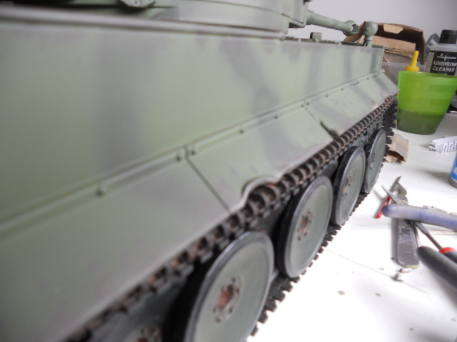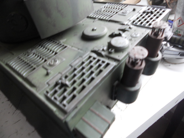 Pretty much finished the paint, just need to make an air intake for the engine deck (the Feifel air filters were sand filters so a stripped down Tiger 1 destined for the European theatre wouldn't have them), and I have modified the barrel rod cleaners, basically removed the tow ropes - need to paint and attach those.
