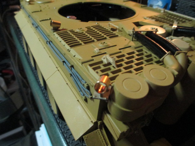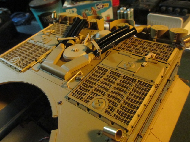 Got up from work at 5:00 and jumped right into Step 27 ( Static Manual ) I got a lot of the Tamiya plastic installed. I did a loose fitment on the Tamiya Jack Block. It looks great and with a little brass enhancement would ring the detail bell. I considered hinging the round armored cover on the far back deck and using it as a lid for an On\Off switch. I did some measuring and the space under it is not deep enough. Was a fun idea. I will use the hatches up front for something like that. Tomorrow or the next day, I will start on the tools and the other brass add-ons for the deck. Step 27 is going to take some time. Pics: