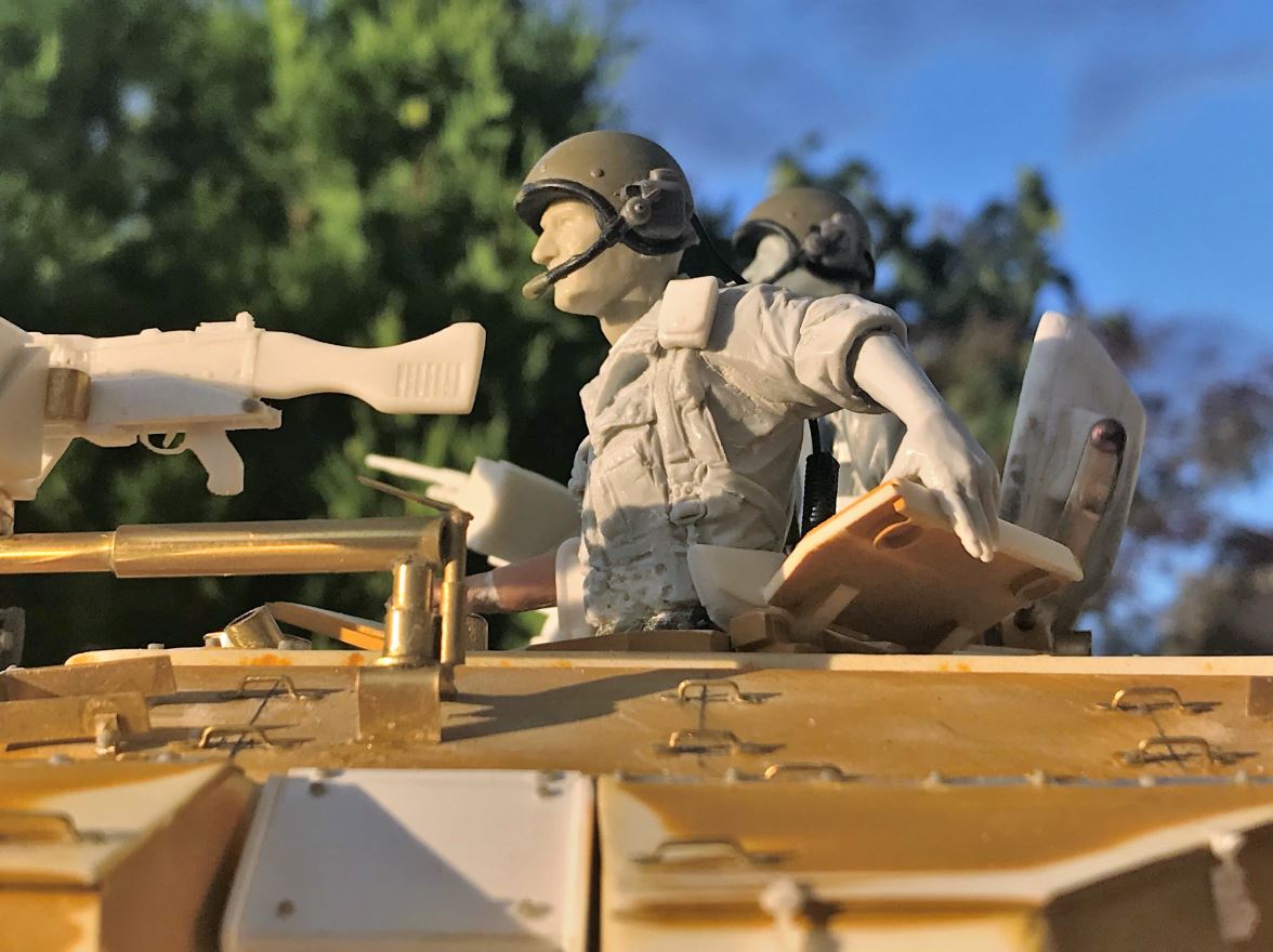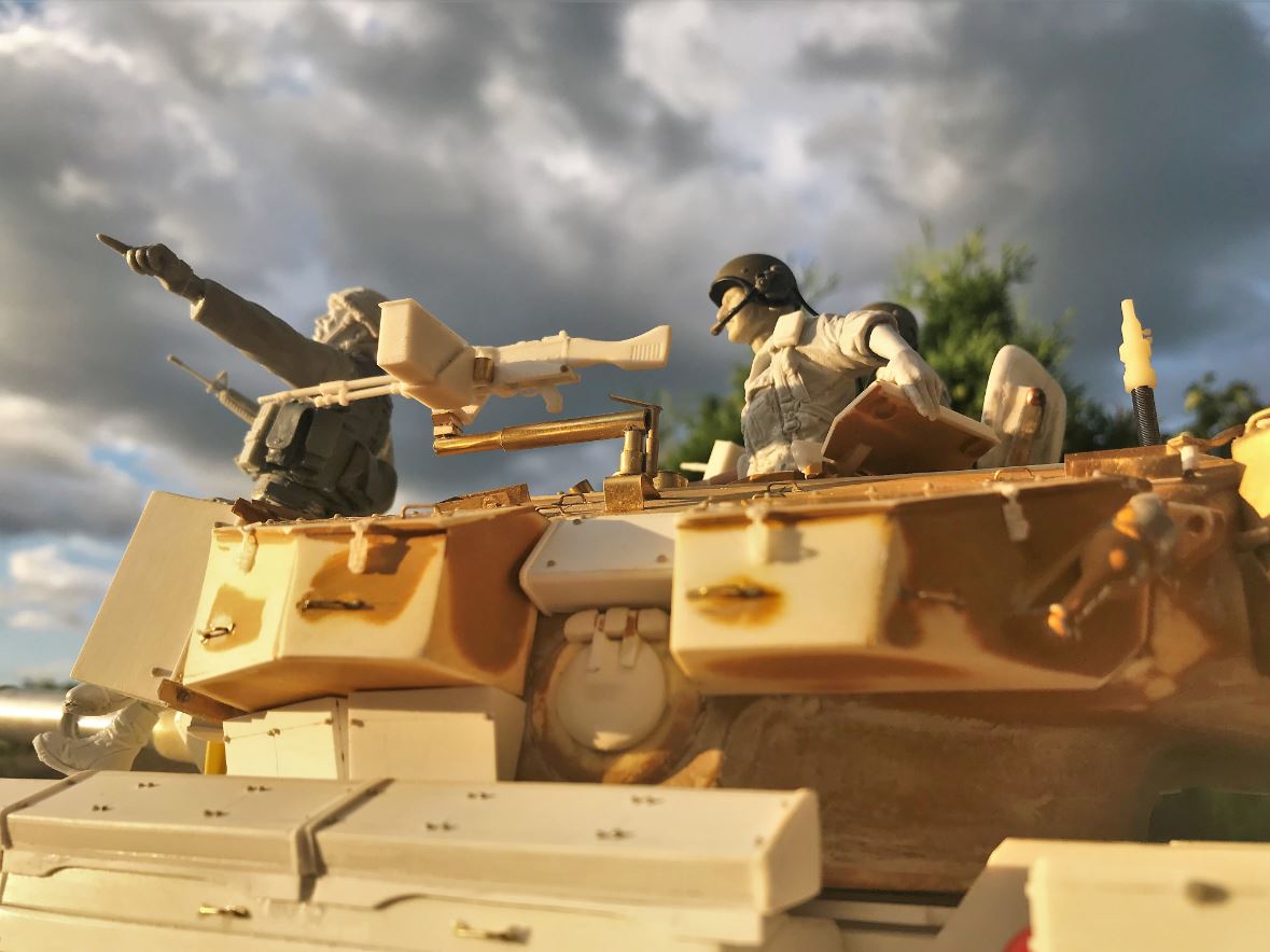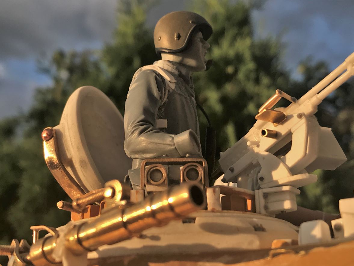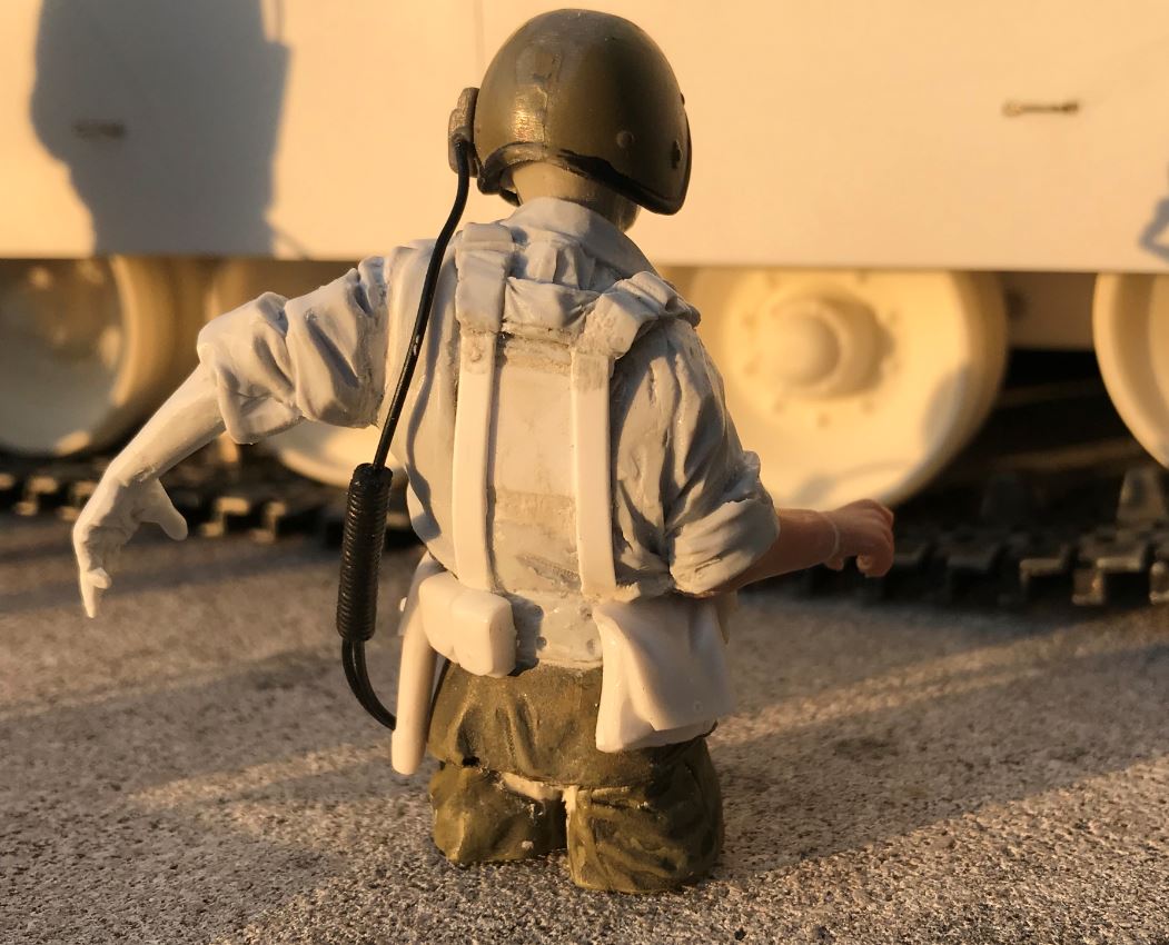 The scenario for the early 1980s vignette is that this is the leading tank of a column that is coming to reinforce an infantry detachment on the Golan Heights amid tensions with the Syrians. The infantry captain is the liaison officer and he is guiding the tank column towards the position where armored support is needed.