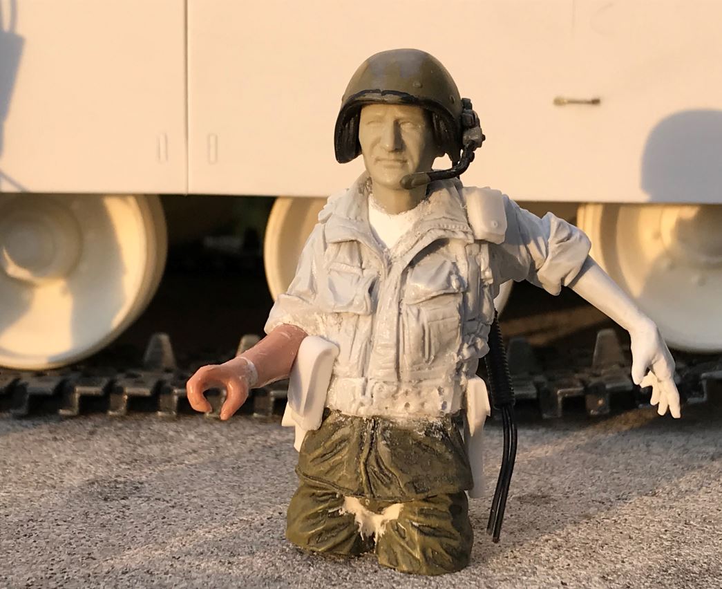 This is the driver, his name is Sharon. A reservist, he thought he would be activated for a few days and its been weeks. He is tired and just hope the whole thing with the Syrians will end soon. His head and helmet are from the Ultimate Soldier M48 crewman. His torso, which is mostly hidden under the hull is coming from a Dragon Vietnam Seal and his shoulders and arms were dramatically reduced in size using the Dremel.