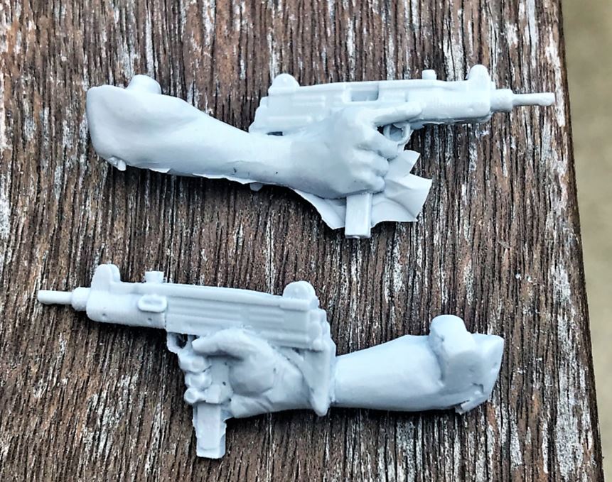 By some luck, the 2 AC Models Israeli 1967 paratrooper figures I ordered are equipped with UZIs. As the figures (one used for the Centurion build) are being modernized, the arm with the UZI was redundant. The idea was to carve out the UZI from the paratrooper's hand.