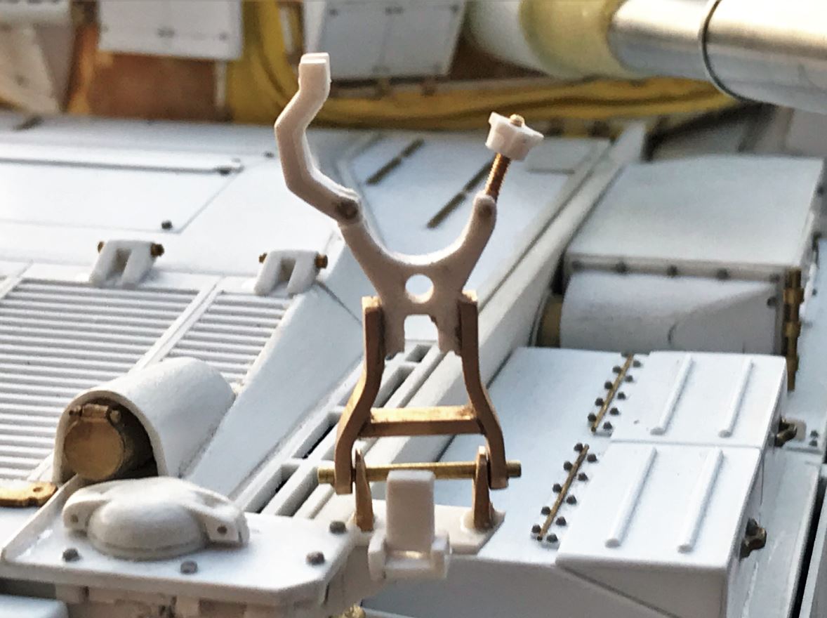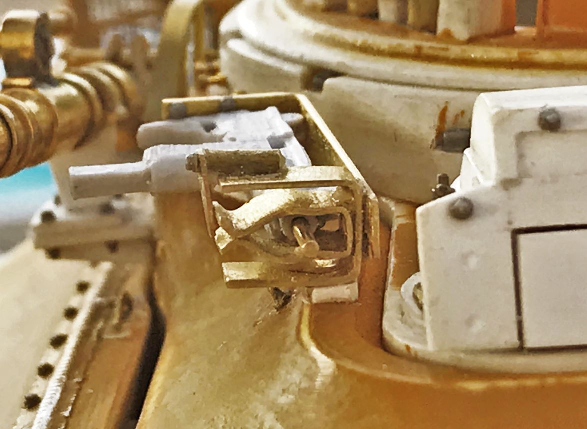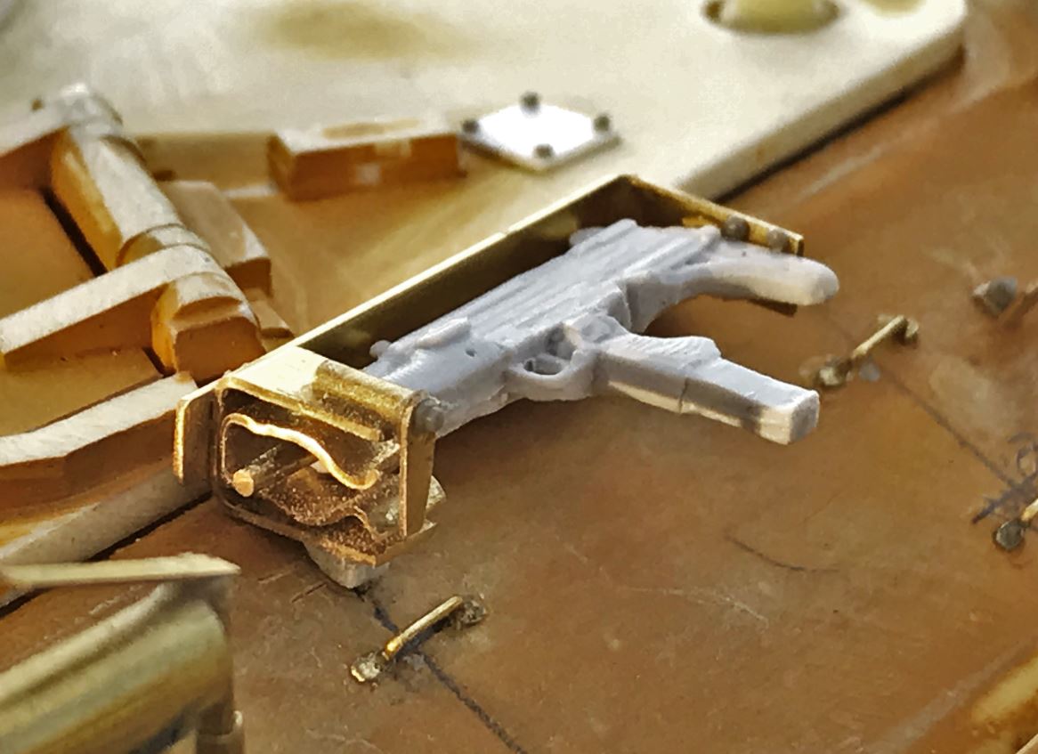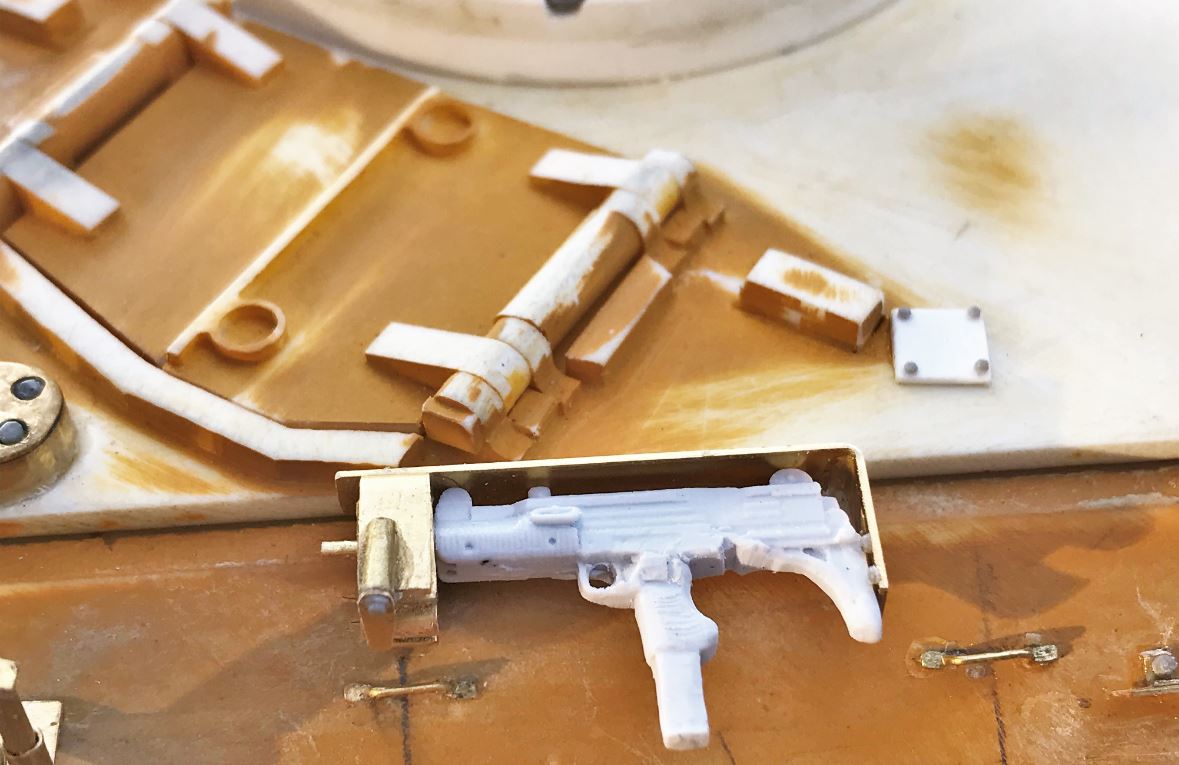 The UZI stands were created in brass. I had to compromise a little bit on the placement of the stands so that the roof of the turret remains removable.