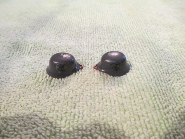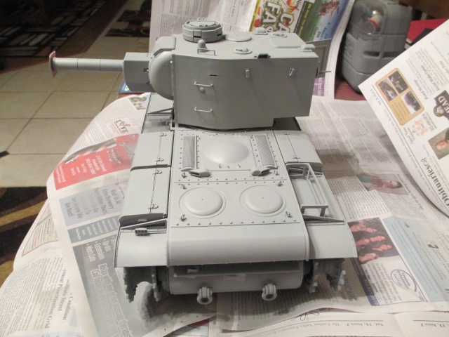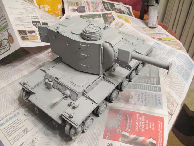 The KV-2 is prepped and primered tonight. I also did some decal work on the Tetra fire extinguisher and those two metal helmets. Pictures: