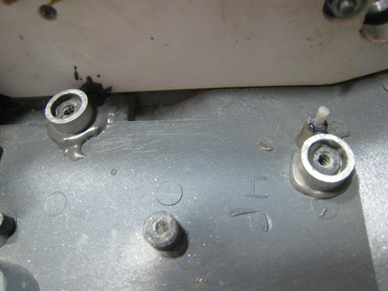 - Gearbox attachment points were reinforced using aluminum tubing (1/4" ID, 9/32" OD, .014" wall thickness)...their lengths extend an extra 1.5-mm (total of about 5.75-mm long) to replace the washers that were used as spacers to raise the gearboxes.