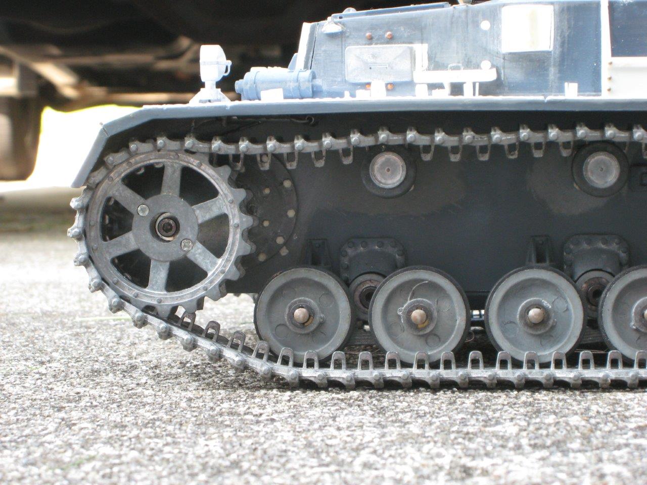 They look pretty good. Not quite level with the return rollers, but you have to look to notice it. I would have liked to raise them another millimeter. But, as it is there isn't quite a millimeter of clearance between the tracks and the forward edge of the fender. Any higher had them rubbing the fenders a lot HL should have made the fenders about 2-mm longer.