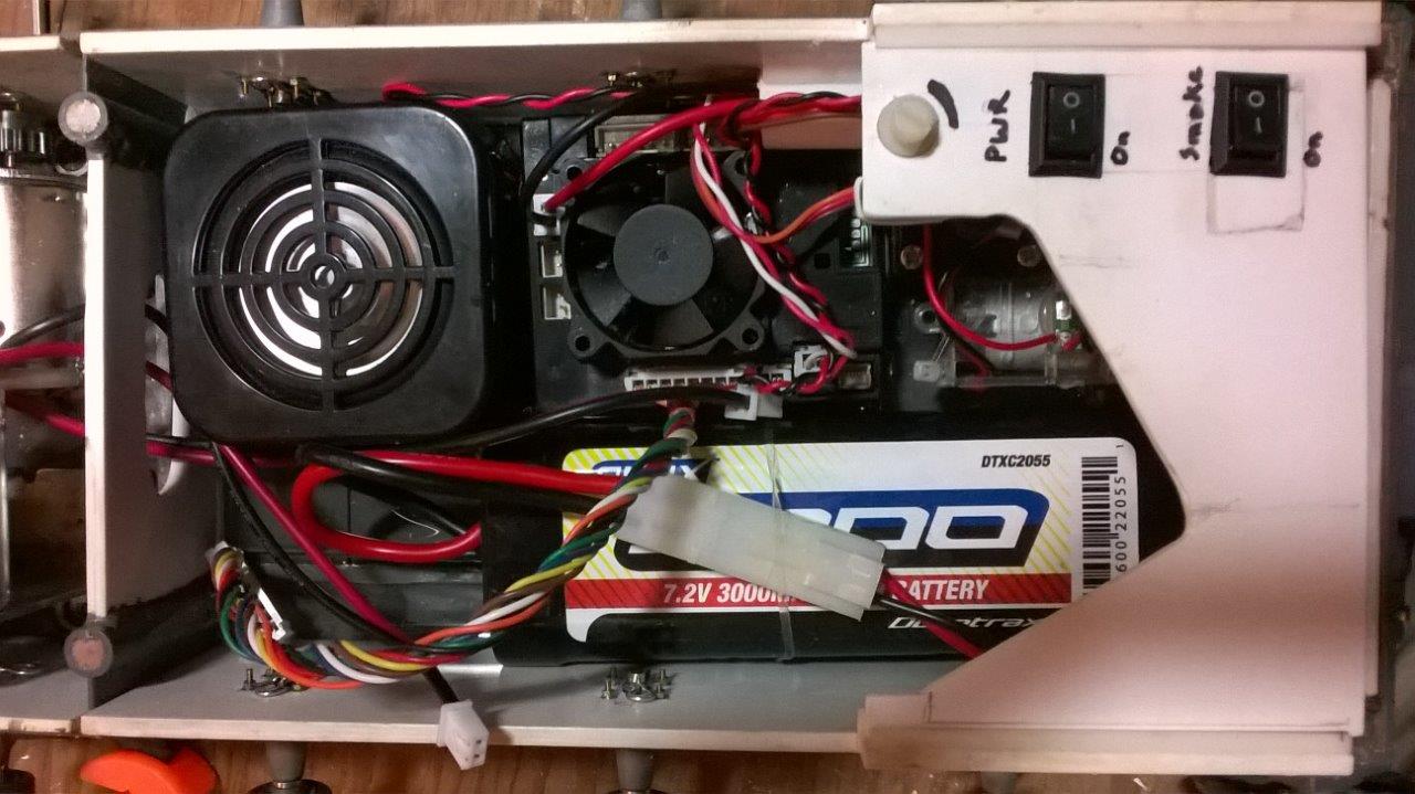 I put together the electrical. There are now small rocker switches on the switch platform for the power and the smoker. The volume knob is there, too. Cabling is tight, but the tube should keep it close to the side and away from the turret wiring.