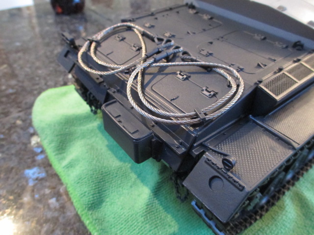 Nothing StuG related in the Post today ( A _huge_ box of Stuart stuff did come in from Sassgrunt for the coming Stuart build. Looking forward to opening that ;o) so I looked at the next bit of Deck detail. On the 1/35 Tamiya model, the rear tow cables are draped, artfully, just so... and look terrific! Mato's version of those cables are made of braided adamantium apparently and had enough torque when looped to shear off two of the mounting pins cast onto the cable clamps. Some cursing and drilling and pinning later, Pictures: