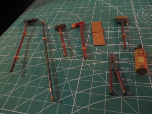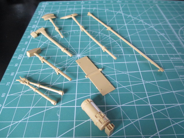 Thank you guys. I can't afford a swelled head, the magnifiers won't fit. ;o) *bows to all* Ecam, Herman, your work is in a class all by itself. Stuff that I aspire to. Tiggr, this will be a fairly fresh tank with all of it's bits and bobs, not long off the ship and barely off the dock. Raminator, the pie was delicious. ;o) Yep, the Wehrmacht soon went to a single rotating weapon on the roof of the turret that could be reloaded from inside the tank. Unlike those previous first efforts at infantry control. Tonight, after a busy day, I sat down and cleaned up and painted the tools. I'll try to get them on by the first of the week. I still need to build up some of the ABER brass for mounts for a couple of them. Pics: