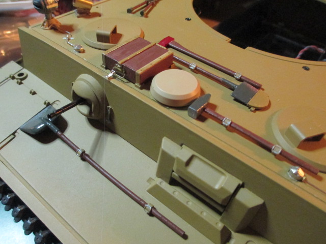 Aussie, many thanks! ;o) This afternoon, I sat down to make mounts for some of the tools and do some more detail painting. I looked up and night had fallen but I am satisfied with the results of these Tamiya\ABER combo mounts. Mike shouldn't lose any tools when he runs the tank. Pics: