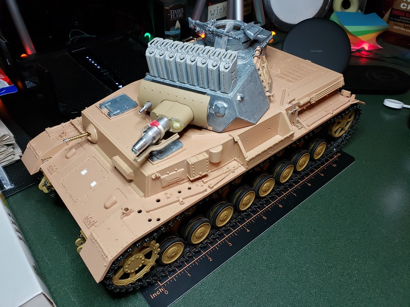 See my above reply to Herman about the rack, strapping and in some cases, rope used to hold those cans secure. Mine are fuel cans, not 'wasser' but I may repurpose a couple of them to have variety in the cans on display on the turret top. Check out the Trojca Book on the Pz IV A-F at War. On pg 117, there is a nice, full page shot of some Ausf 'D's in Africa with the type of turret rack setup I am going to use.