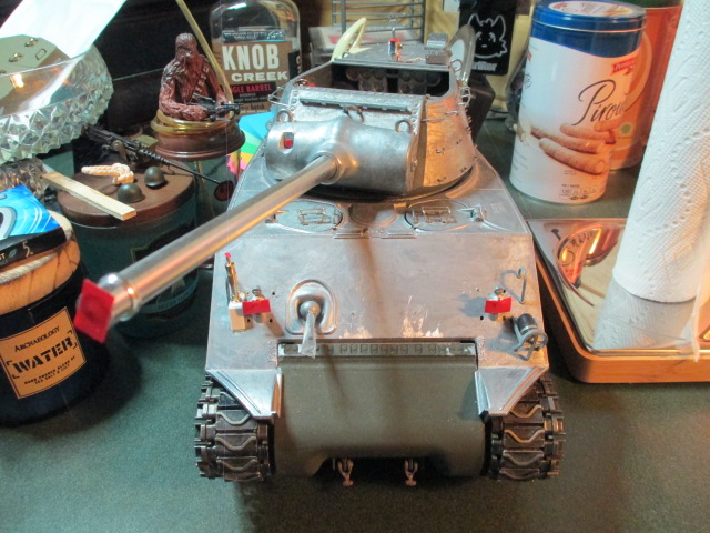Having spent the last four days working 'at' getting the M36B1 ready for exterior paint, I thought I had better add a post to keep track of what's been done. The Schumo shipment is still a week out from ETO so those Sherman bits are that + a few days from me. I've given up on the 1/18 fire extinguisher from Singapore. I ordered a replacement today from here in the states. It's 3 times pricier but it looks three times better right off the bat as well. Progress is slow but I have taken a page from the Good Doctor Phibes tonight and cleaned up the rear bulkhead of the vehicle, again, all in the 'getting ready for paint' frame of mind. Pics: