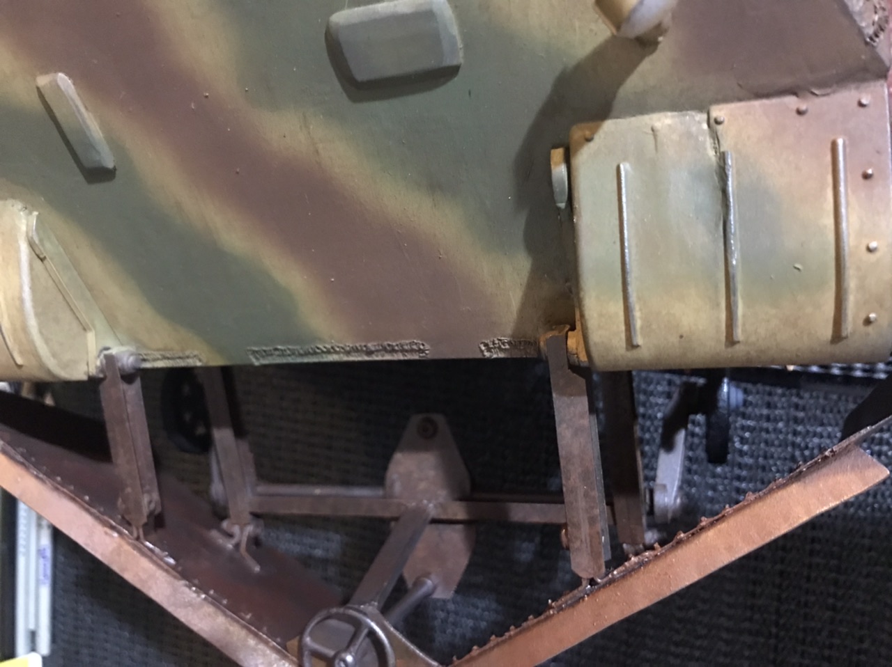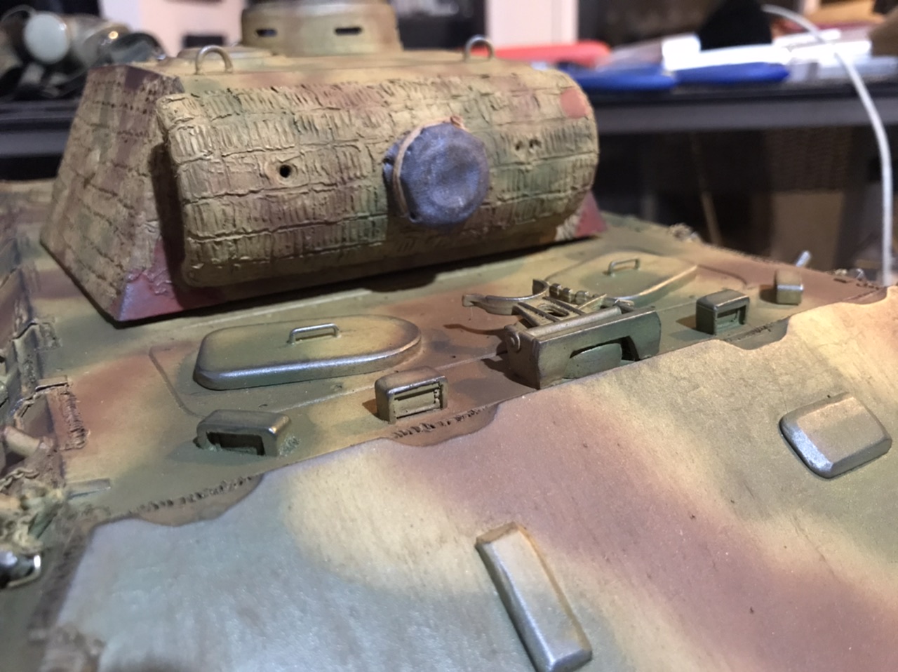 To cover the hole in the mantlet that the absent gun left I used a patch of cloth secured with a small rubber band used to retain braces, and once in place additional cover with a length of embroidery yarn coloured as rope.