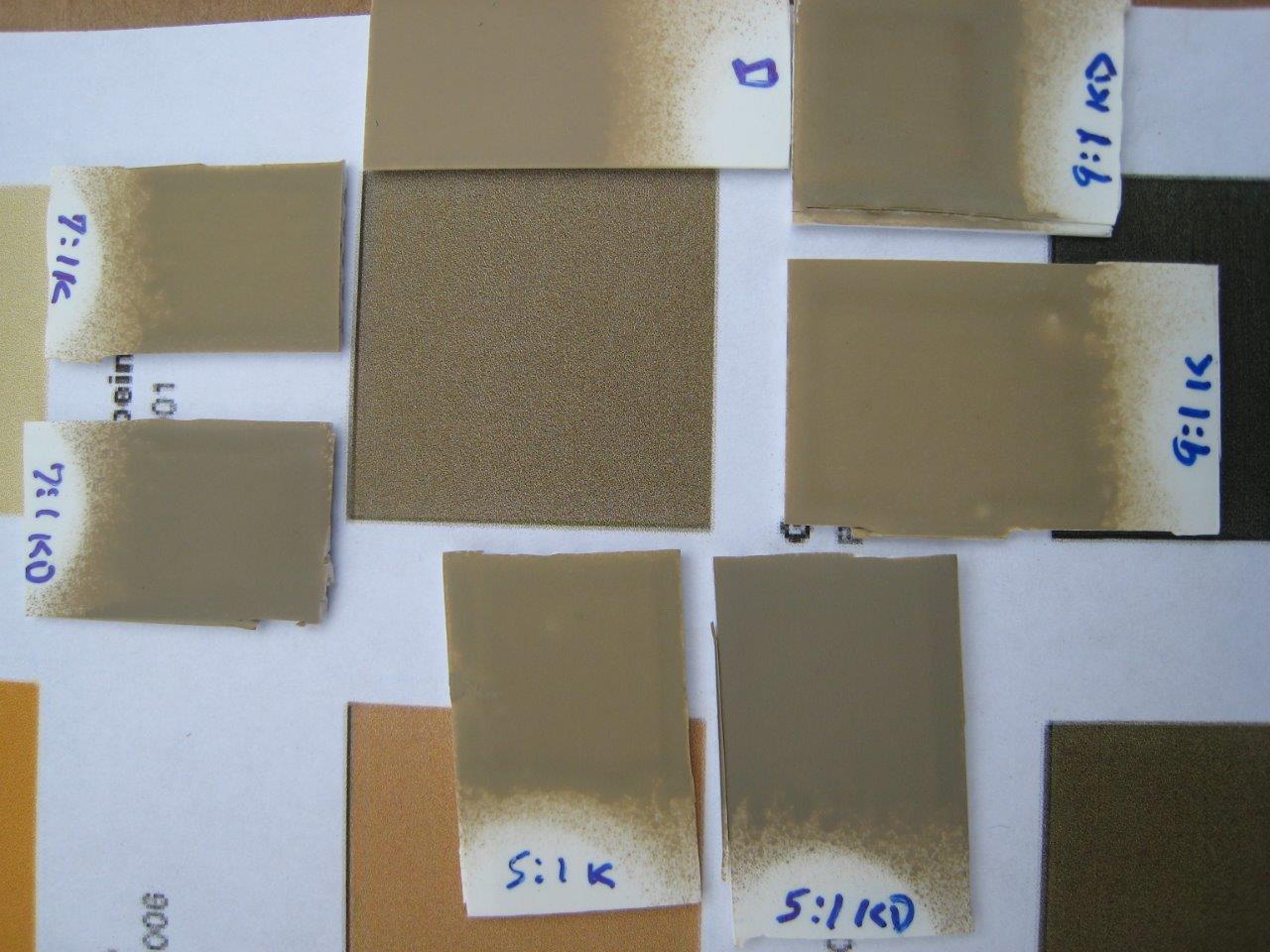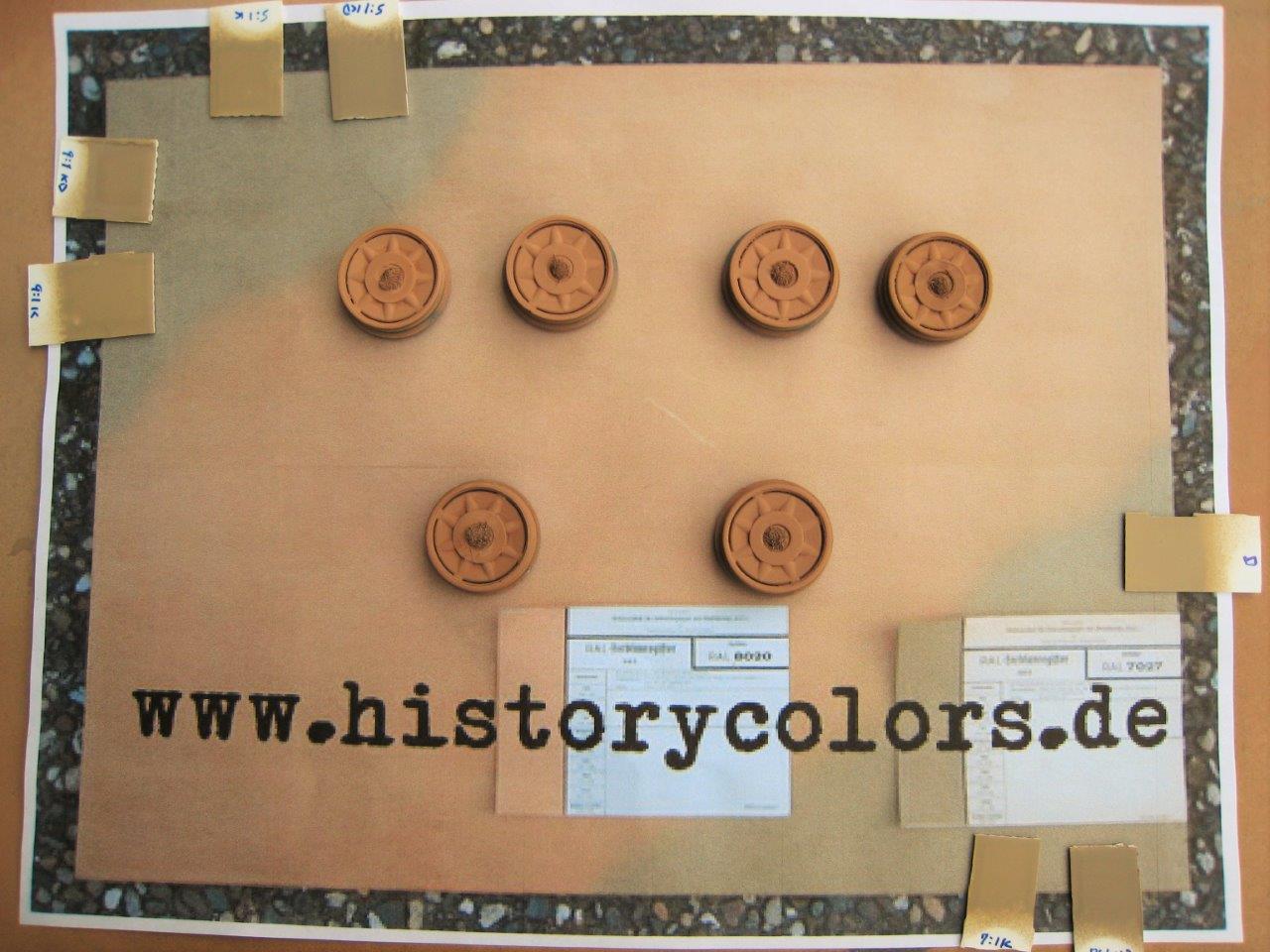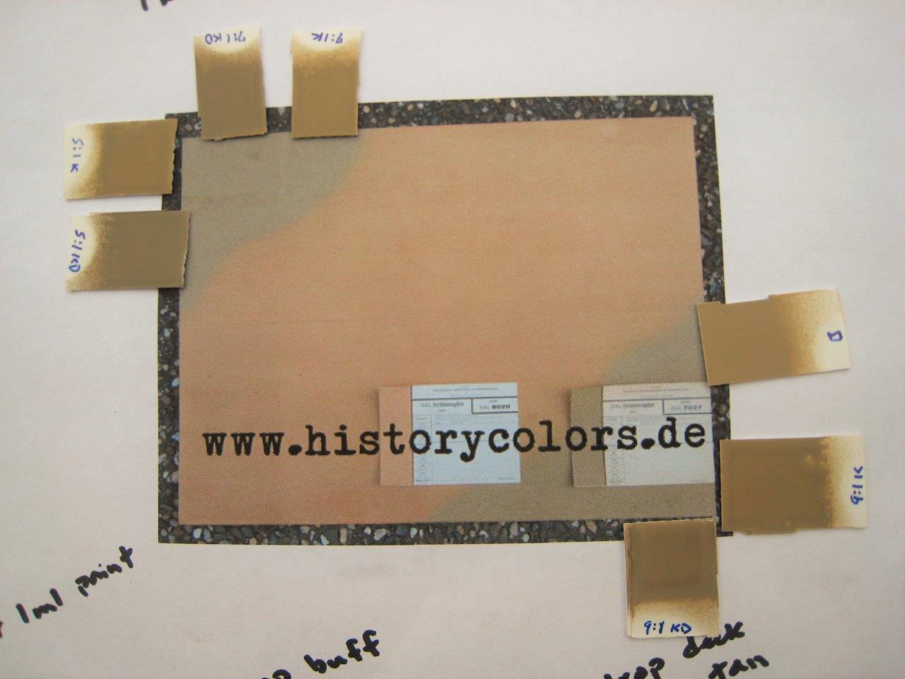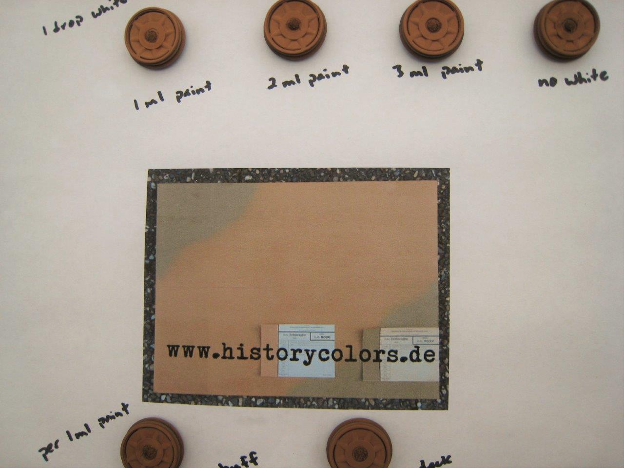 There also seems to be some disagreement on the hues in RAL 7027. It’s generally a greyish color. But, some think it should have a brown hue and others a slight greenish tint. So, I’ve added different amounts of either Khaki (XF-49) or Khaki Drab (XF-51) to Buff (Tamiya calls for straight Buff) to see how they look with the grey color, but slight greenish tint. I think the Khaki Drab is best, but I haven’t tried this over the base color yet.