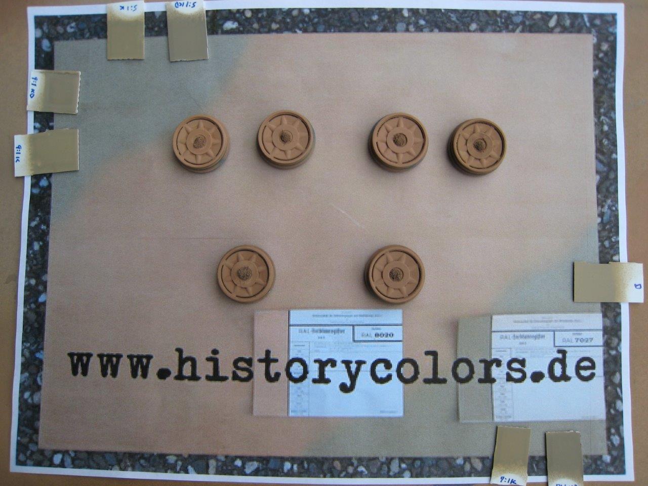 I’ve also been playing with the shades and hues of Tamiya’s recommended mixture for RAL 8020. Looking at the various references that I’ve compiled, there doesn’t seem to be a lot of consensus regarding the shade of the color. Some indicate that it is a very light tan with a reddish or pinkish hue. Others indicate a darker brown that still has the reddish hue. Looking at some of the B&W photos that would seem to represent freshly arrived tanks, I think it should be a little bit on the darker side. My tests have used the Tamiya mix (5:2... Flat Flesh:Red Brown or XF-15:5 + XF-64:2). Then, I’ve experimented with adding a drop of either Flat White to different amounts of mixed paint (1 ml, 2 ml and 3 ml) or a drop of Buff (XF-57) or a drop of Deck Tan (XF-55) to 1 ml of mixed paint. I think that I like the straight mixture (no white) for the lower hull and shaded areas of the tank and the 2 drop of white per 1 ml for the upper hull and turret. Although admittedly, I’m not sure that I can see a difference except if I look really close and maybe in bright sunlight.