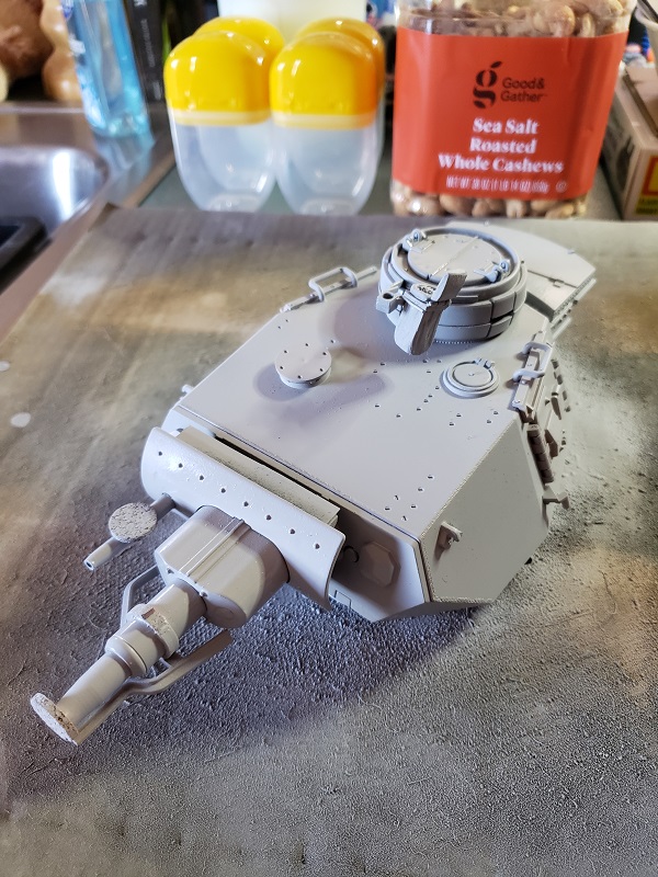 I spent the afternoon napping in my chair in between bouts of printer and paint. At the end of it all, the basic DAK color is applied to all of the major components now. Ahead lies hours of detail paint and detailing. It will be fun! ;o)