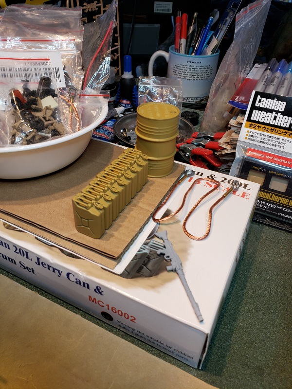 Cans and Drum in paint...The MG34 is in primer awaiting a detail to be added...Tow cable remains copper until painted and weathered..jpg