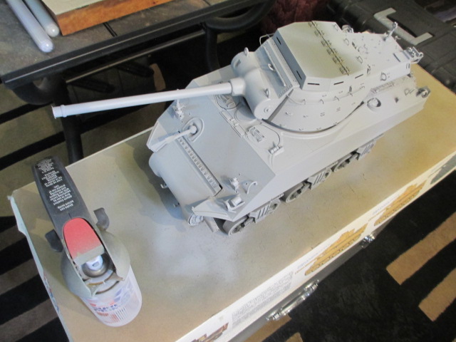 Today was a great day to do more prep work. The sprockets and idlers got primered and painted using Tamiyas grey metal and plastic primer and Model Masters Olive Drab. After that, I put the tin roof back on since the turret insides are going to be a detail paint job. The rest of the TD was primered with two good coats of the Tamiya. It really is excellent stuff. Tomorrow afternoon, I should be able to paint it. Pics: