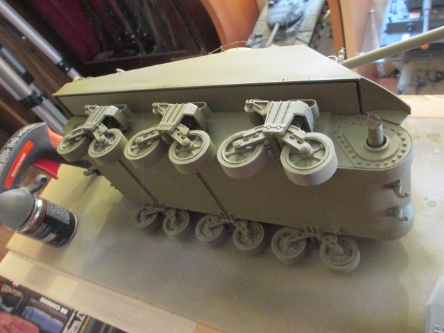 ) Every road wheel rolled along fine. ( Thanks Jack! ) All of the running gear will get a thorough lube job once the painting is done. Just a couple of pics tonight, more to follow tomorrow.