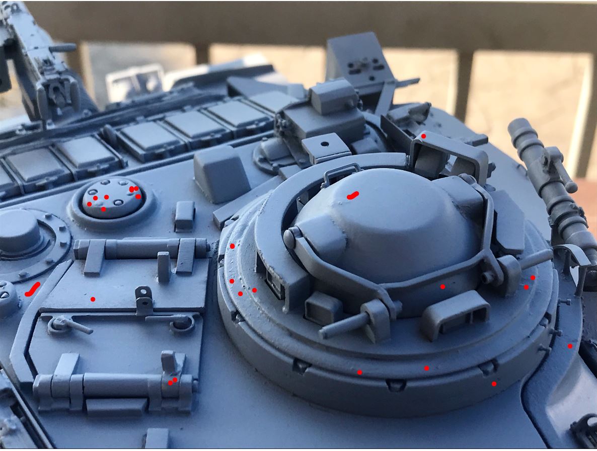 Close up pictures of every areas of the primed model are taken and inspected. Corrective measures will be applied. This step is very important as it will greatly improve the look of the model and its ability to sustain close up inspections by unforgiving modellers on the web.