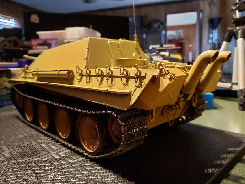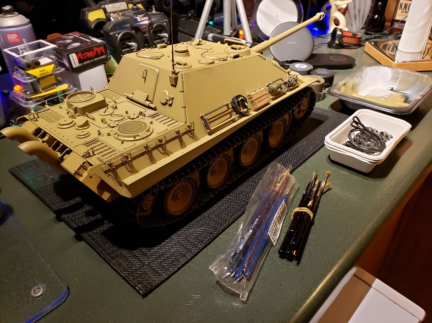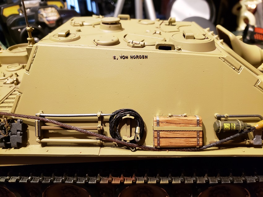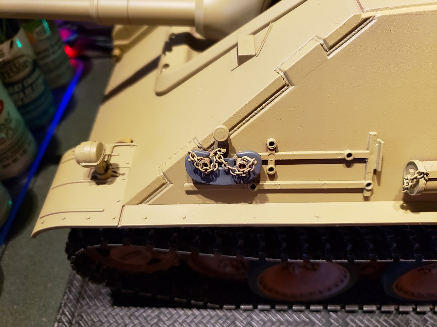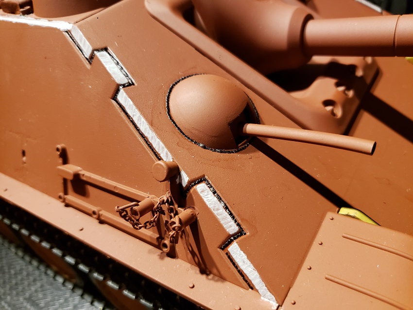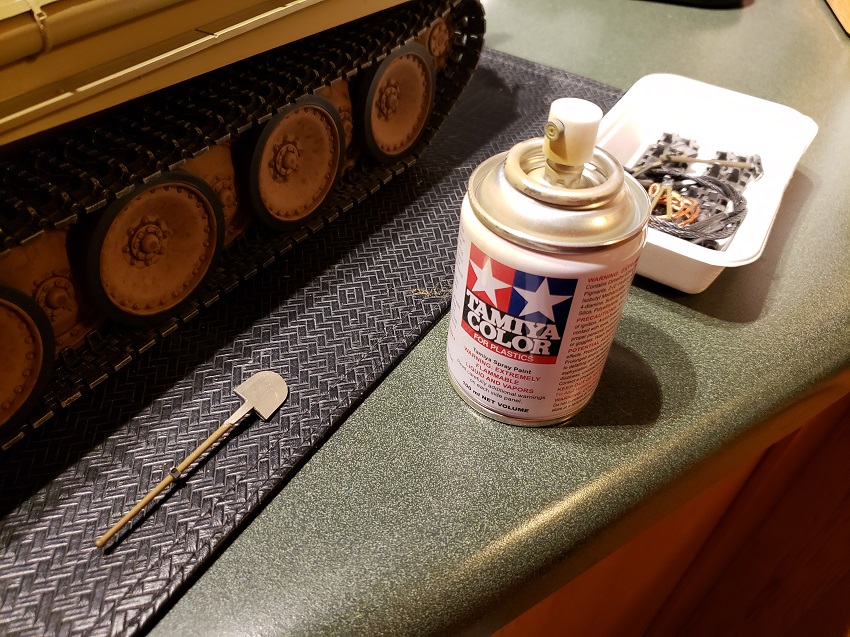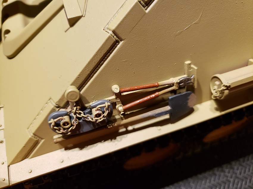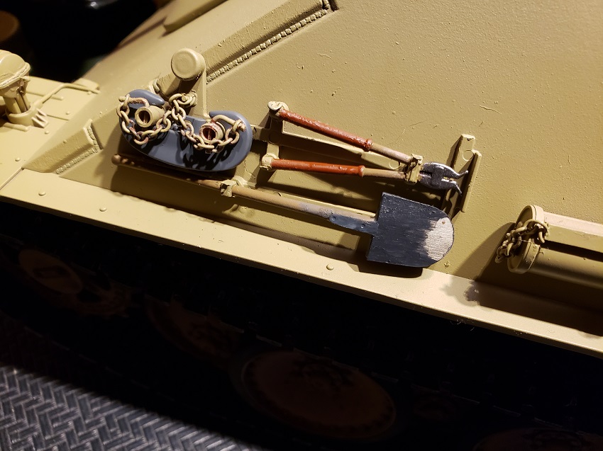 For wood, I sometimes use a stock I put up of the now-defunct Testor's Wood Enamel, also over a wire-brush scratched surface (brass for plastic, steel for metal). I have painted tool heads so many different ways I cannot remember. I have tried Testor's "Steel" enamel and Vallejo "Steel," even Vallejo "Oily Steel"; also Tamiya and Testor's (enamel and acrylic) and Vallejo and AK Interactive "Gun Metal"---egad, what else? In every case, I have painted any tool clamps or attachments to the tank in the adjoining color as if the crew bothered to take the tools off before spraying camouflage. For US tanks, I have used the types of finish above, but also sprayed others all OD (which was often done right at the factory) or even a matte finish (imitating the lacquer sometime applied to the metal heads on US tools).