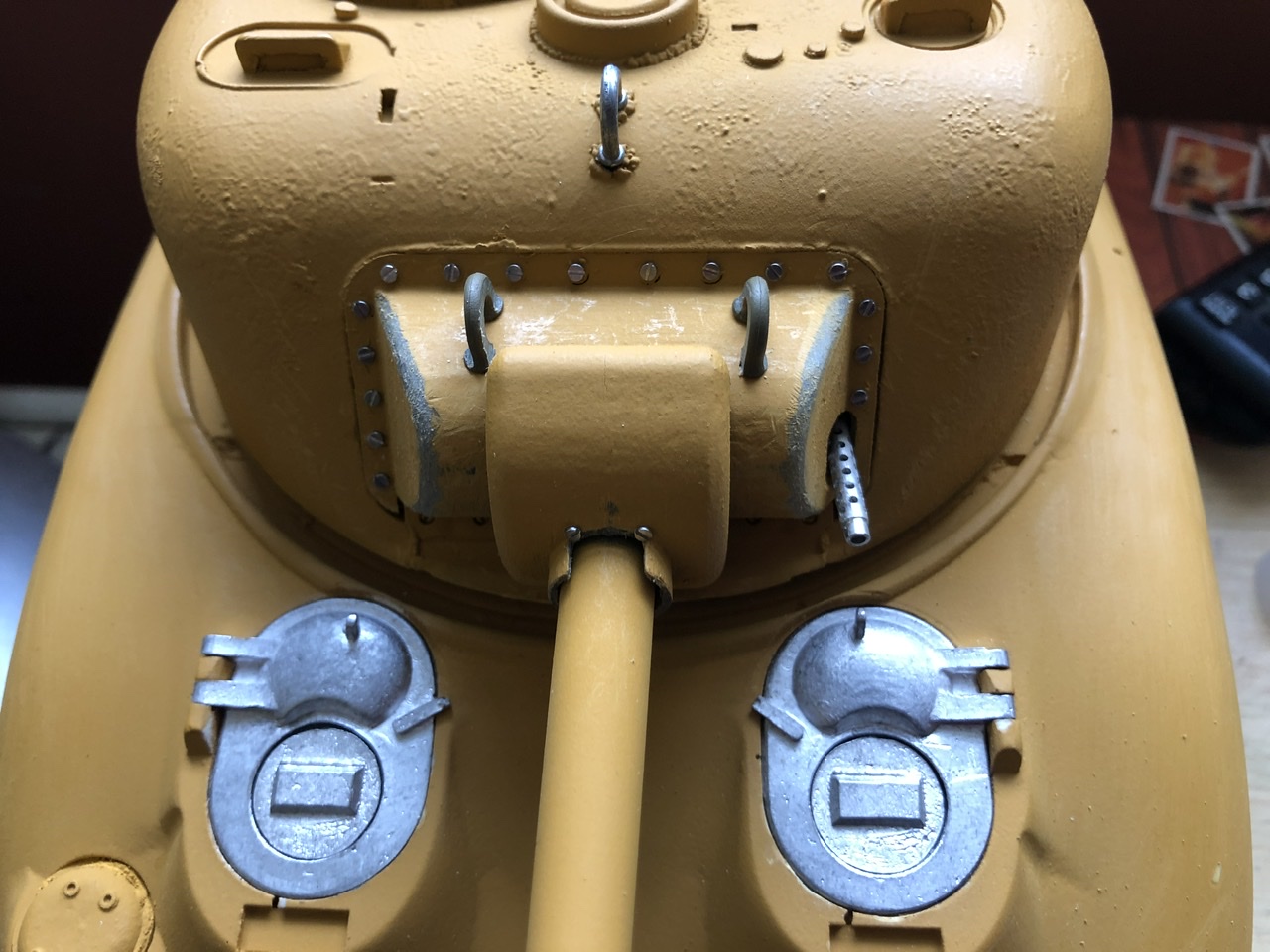 A little cosmetic work. Mantlet screws crane eyes and front hatches, turret mg is now fixed bow mg still needs a little filing